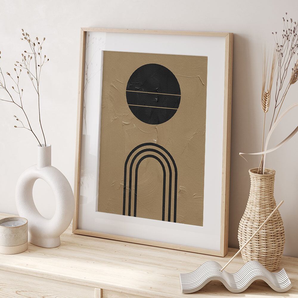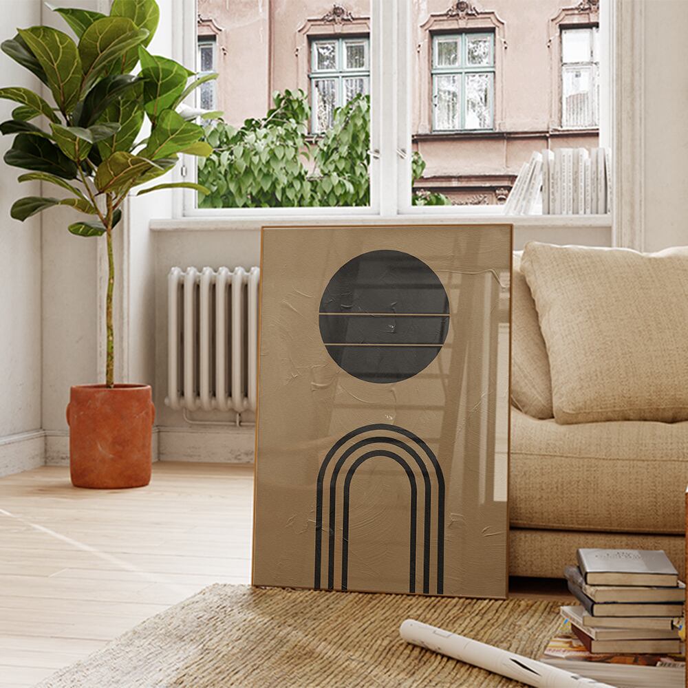 ベージュ、ブラウン、ブルーを背景に、抽象的なラインや丸、半円などをデザインしたモダンなアートポスターです。