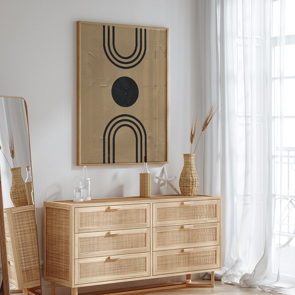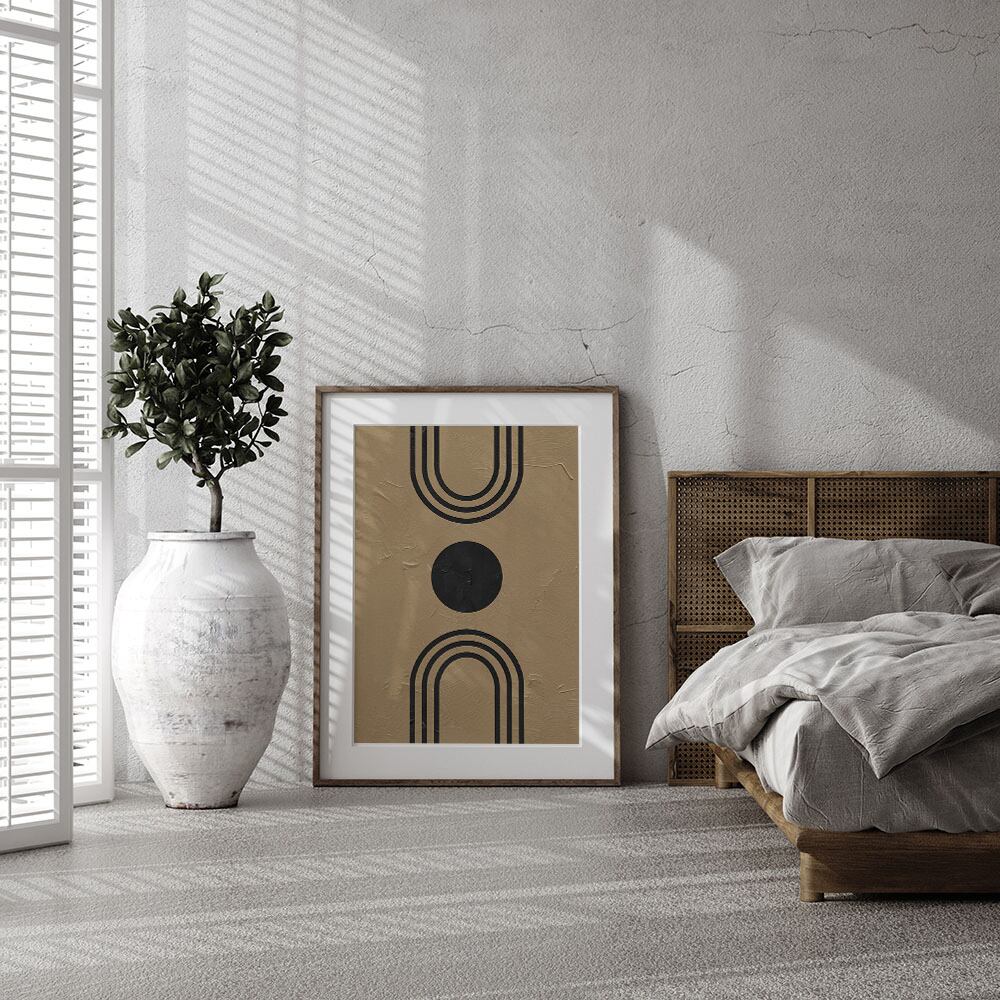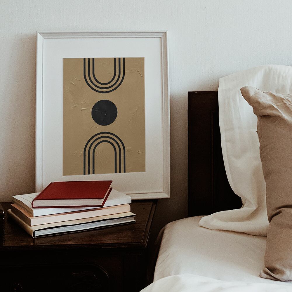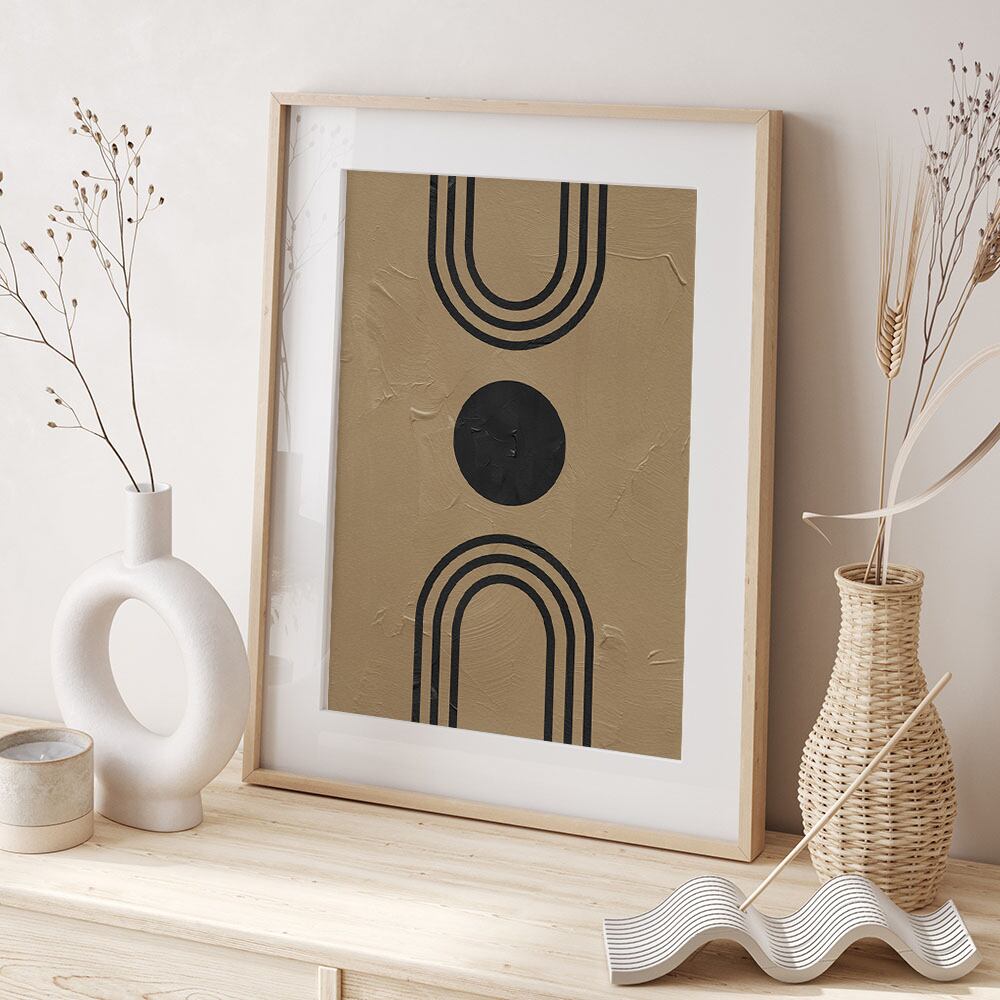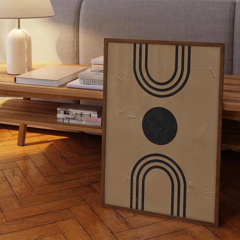 ベージュ、ブラウン、ブルーを背景に、抽象的なラインや丸、半円などをデザインしたモダンなアートポスターです。