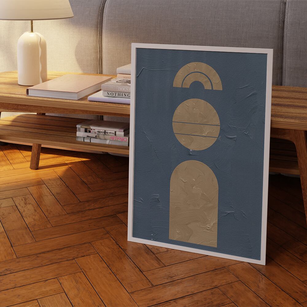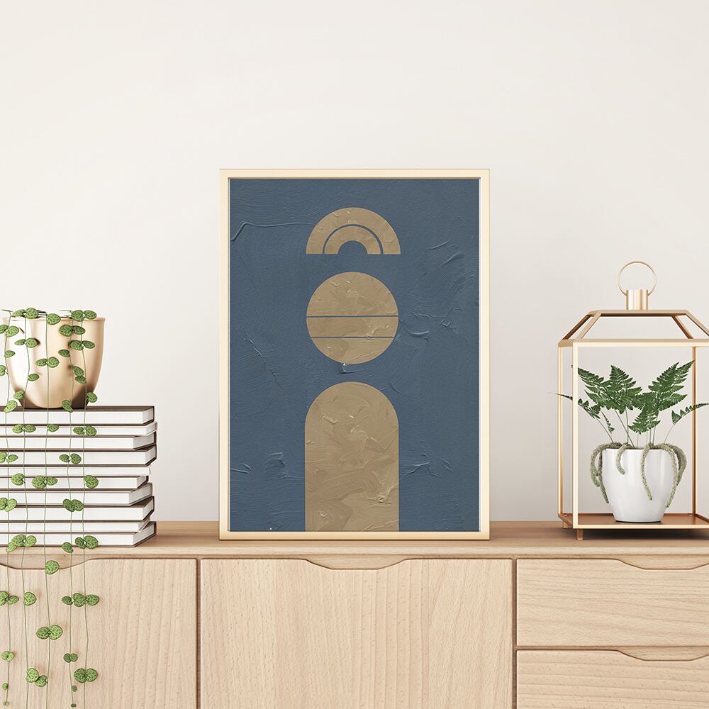 ベージュ、ブラウン、ブルーを背景に、抽象的なラインや丸、半円などをデザインしたモダンなアートポスターです。
