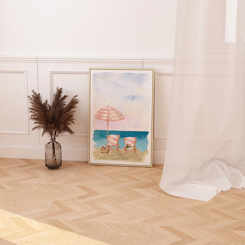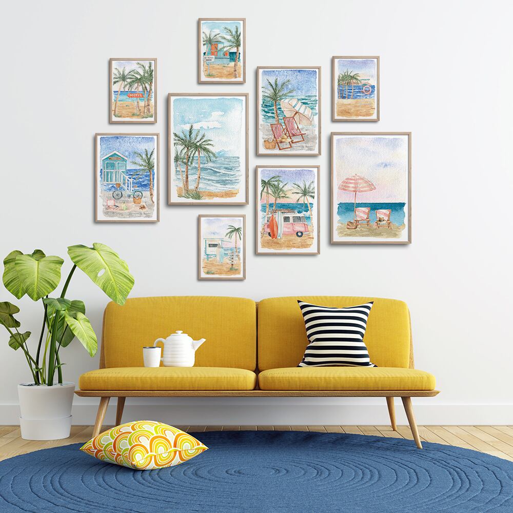 ヤシの木やワゴン、サーフィンボードや自転車など、海岸の景色のポスターです。明るい色合いの水彩画で、とても夏にぴったりです。