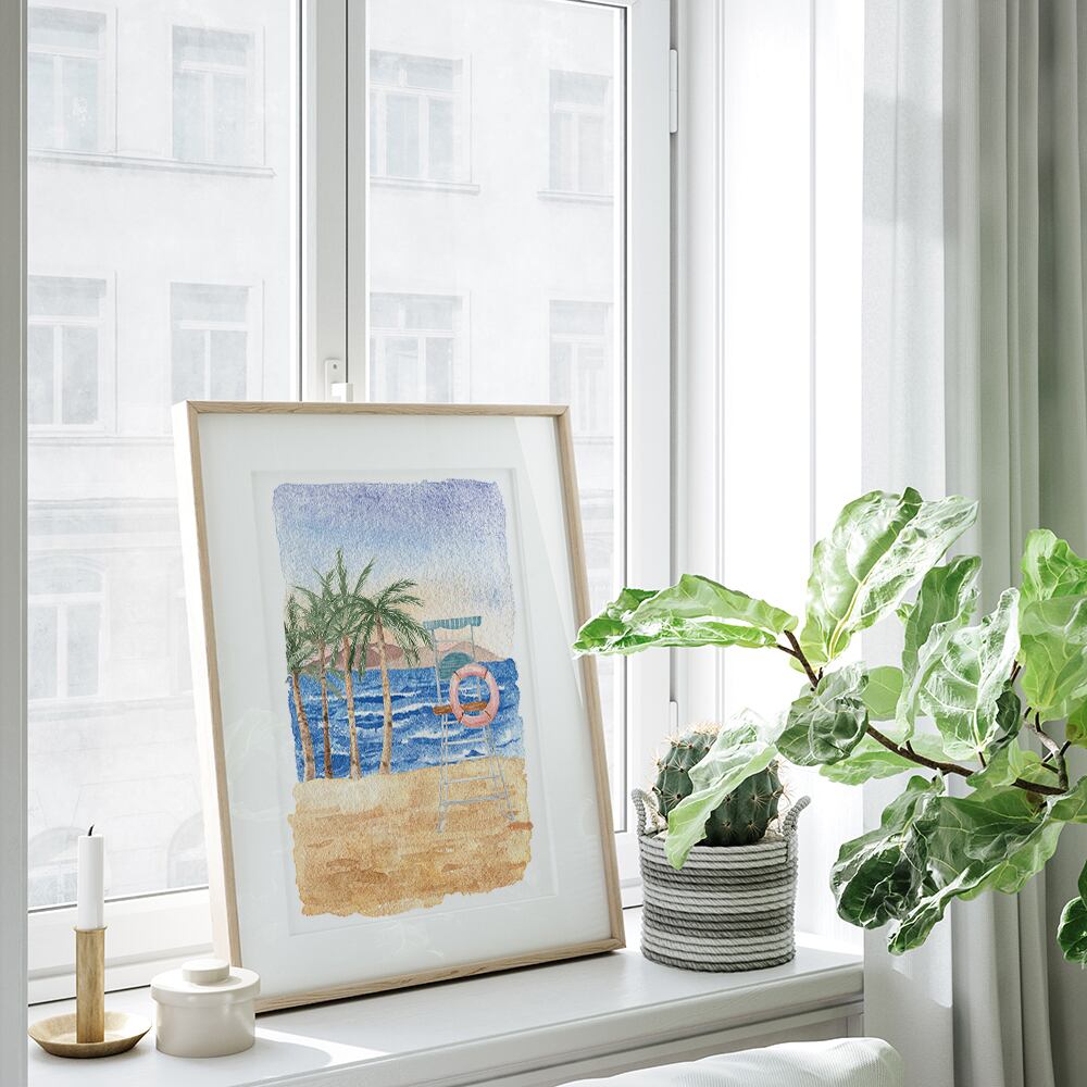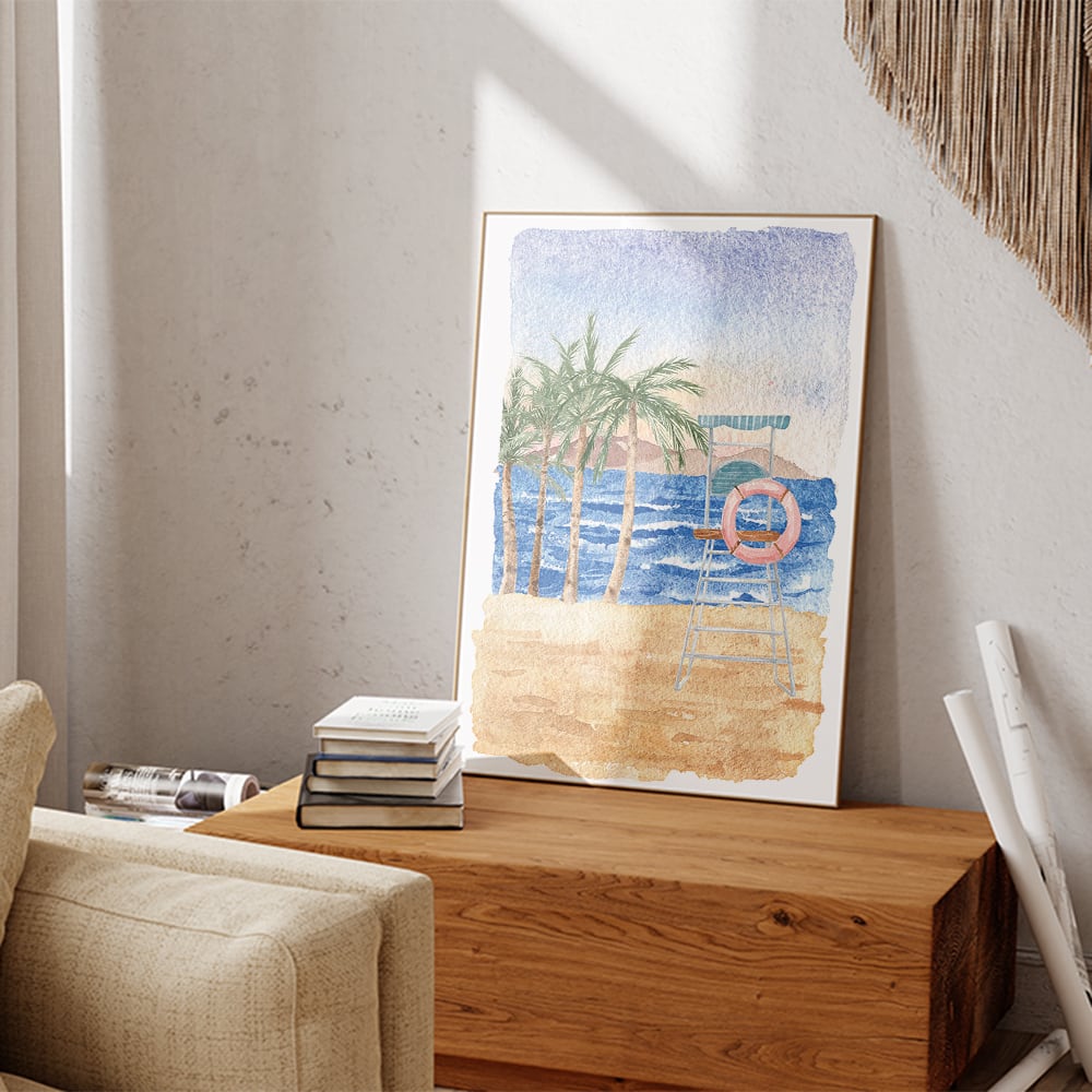 ヤシの木やワゴン、サーフィンボードや自転車など、海岸の景色のポスターです。明るい色合いの水彩画で、とても夏にぴったりです。