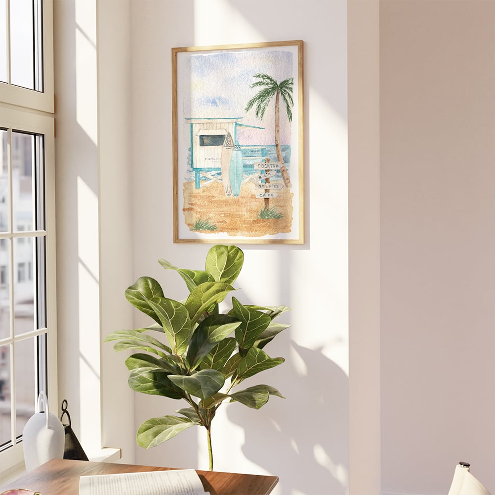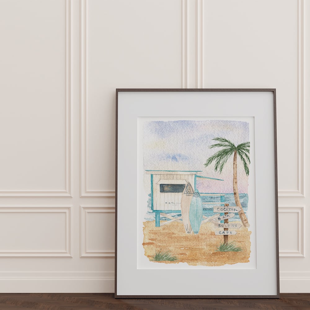 ヤシの木やワゴン、サーフィンボードや自転車など、海岸の景色のポスターです。明るい色合いの水彩画で、とても夏にぴったりです。