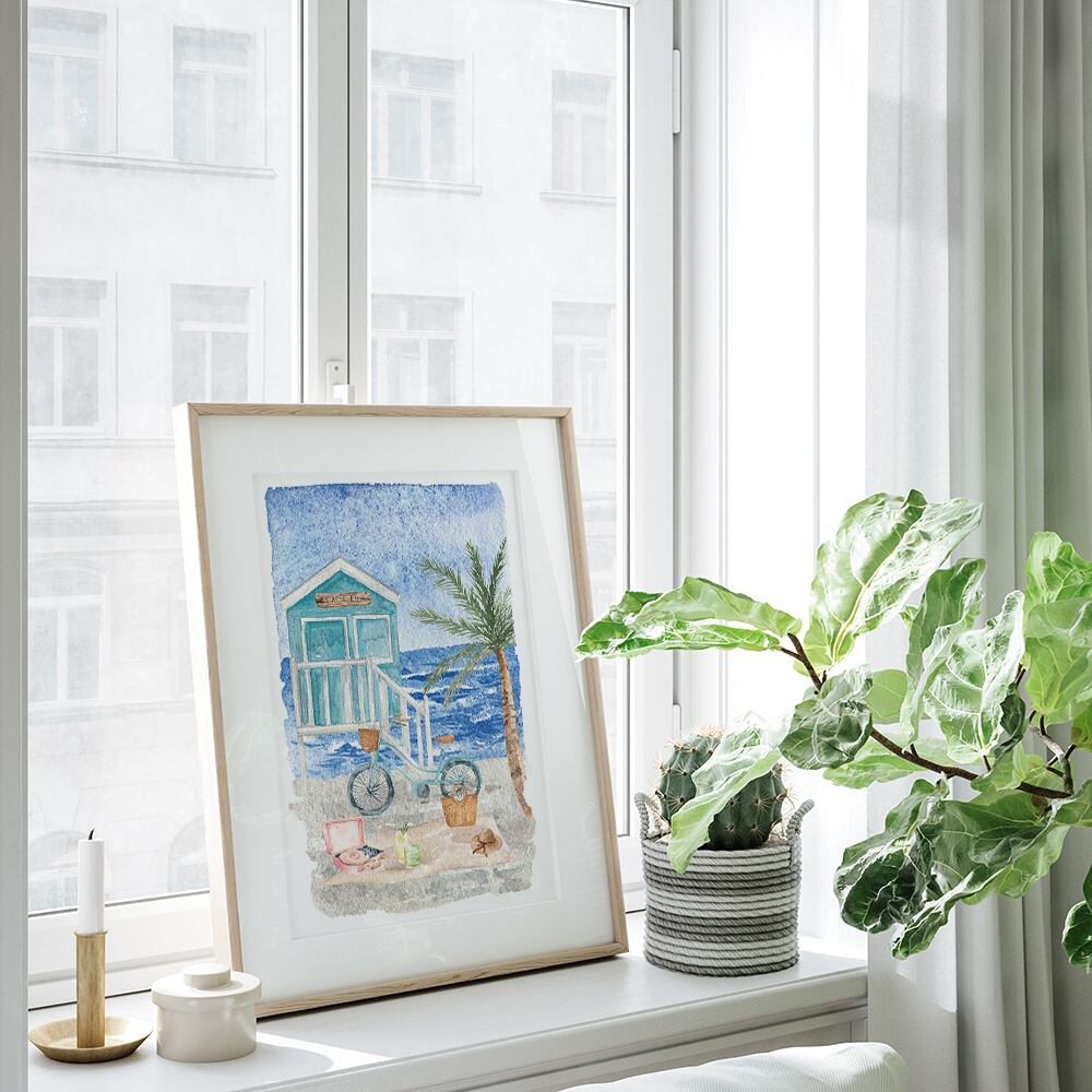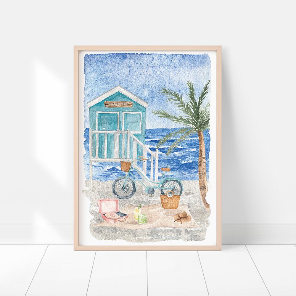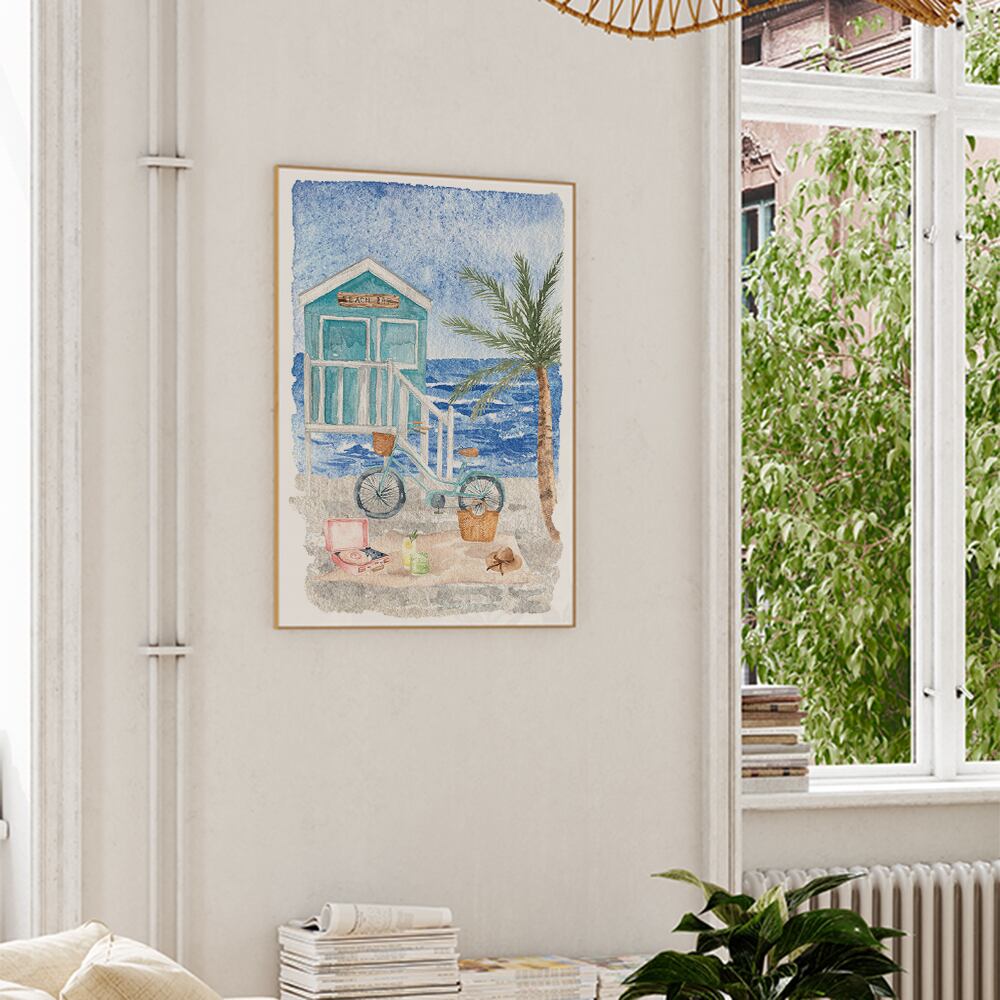 ヤシの木やワゴン、サーフィンボードや自転車など、海岸の景色のポスターです。明るい色合いの水彩画で、とても夏にぴったりです。
