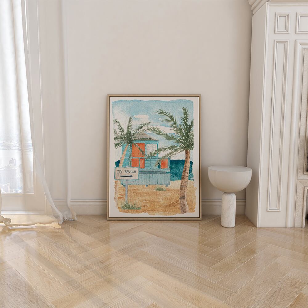 ヤシの木やワゴン、サーフィンボードや自転車など、海岸の景色のポスターです。明るい色合いの水彩画で、とても夏にぴったりです。