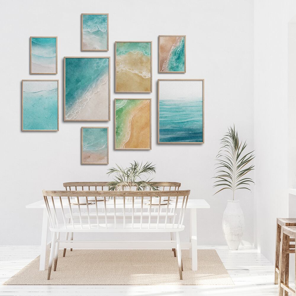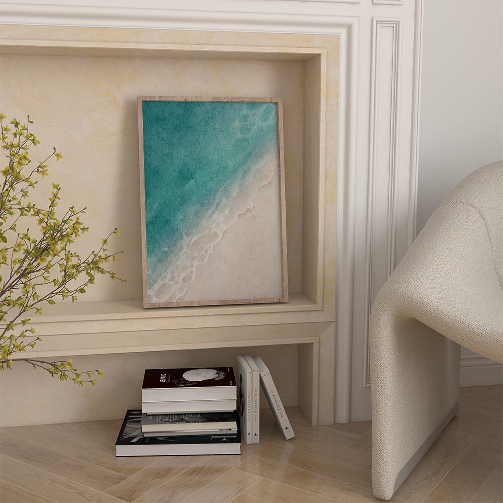 エメラルドグリーンの海、白い砂浜のポスターです。水彩タッチで透明感のある水の様子が表現されています。お部屋の中でも夏の海を楽しんでみませんか?