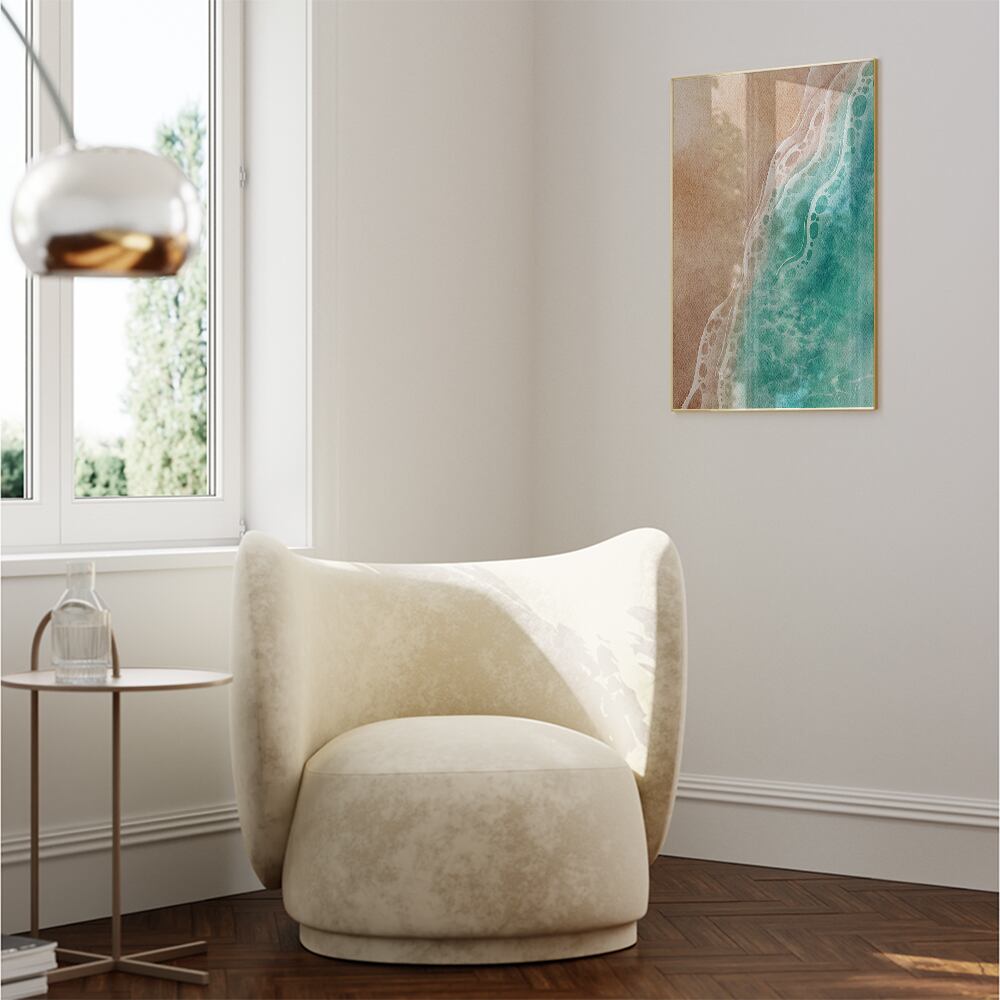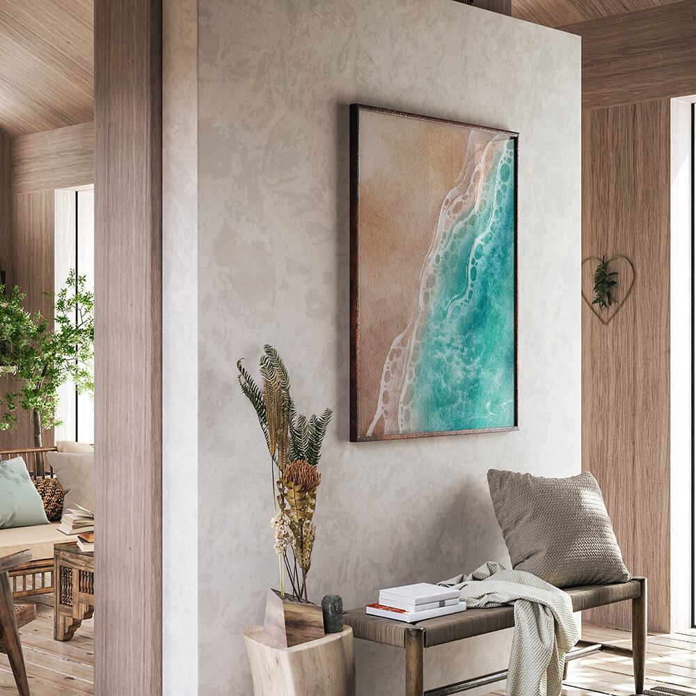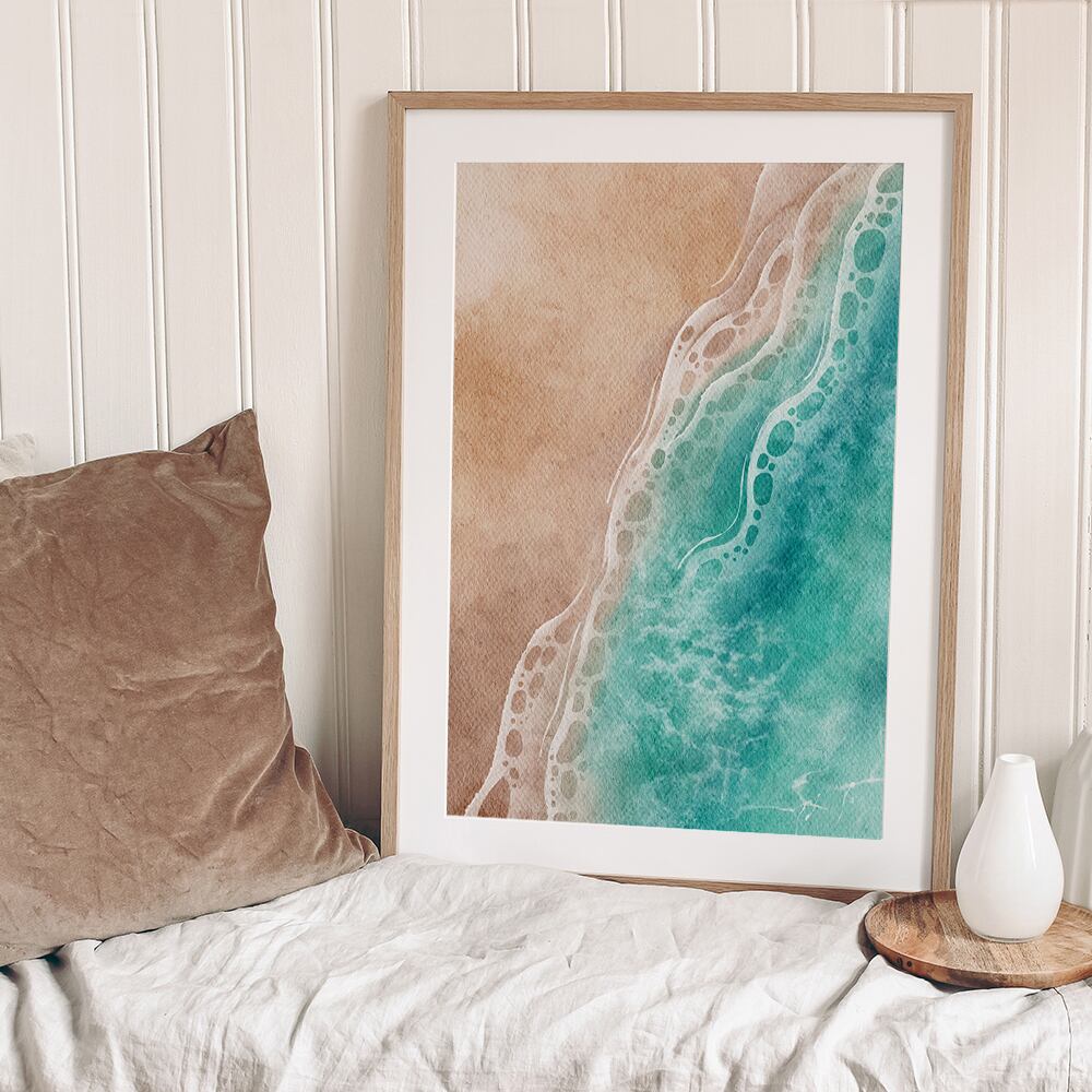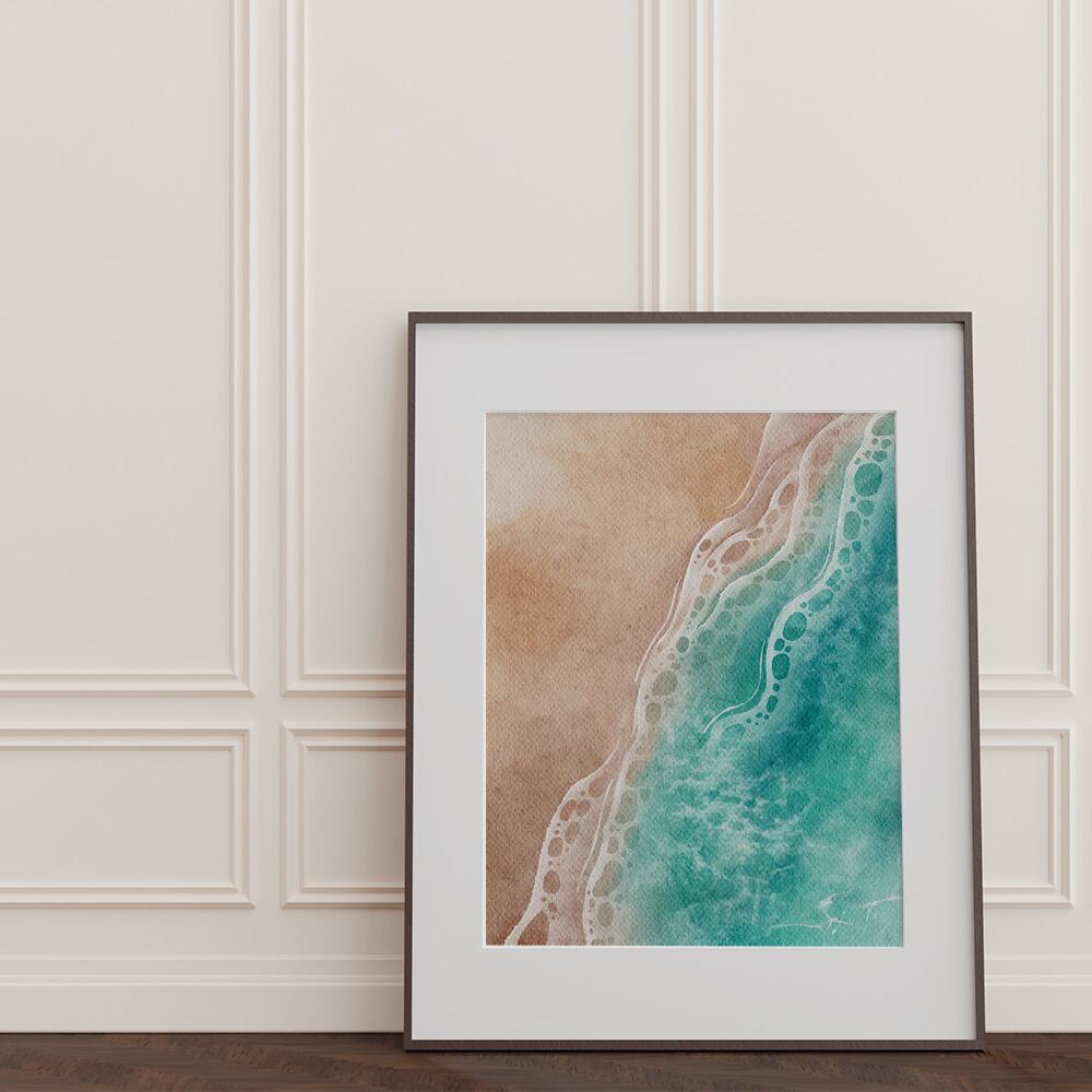 エメラルドグリーンの海、白い砂浜のポスターです。水彩タッチで透明感のある水の様子が表現されています。お部屋の中でも夏の海を楽しんでみませんか?