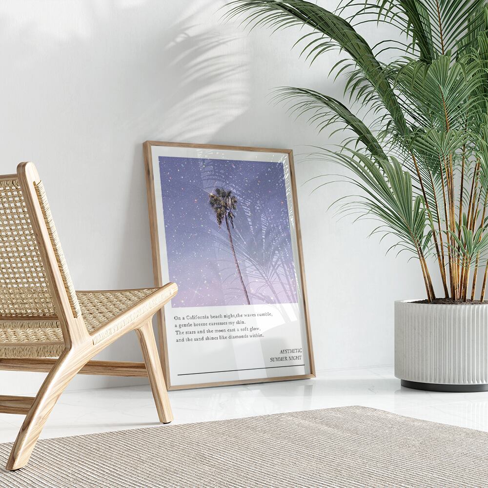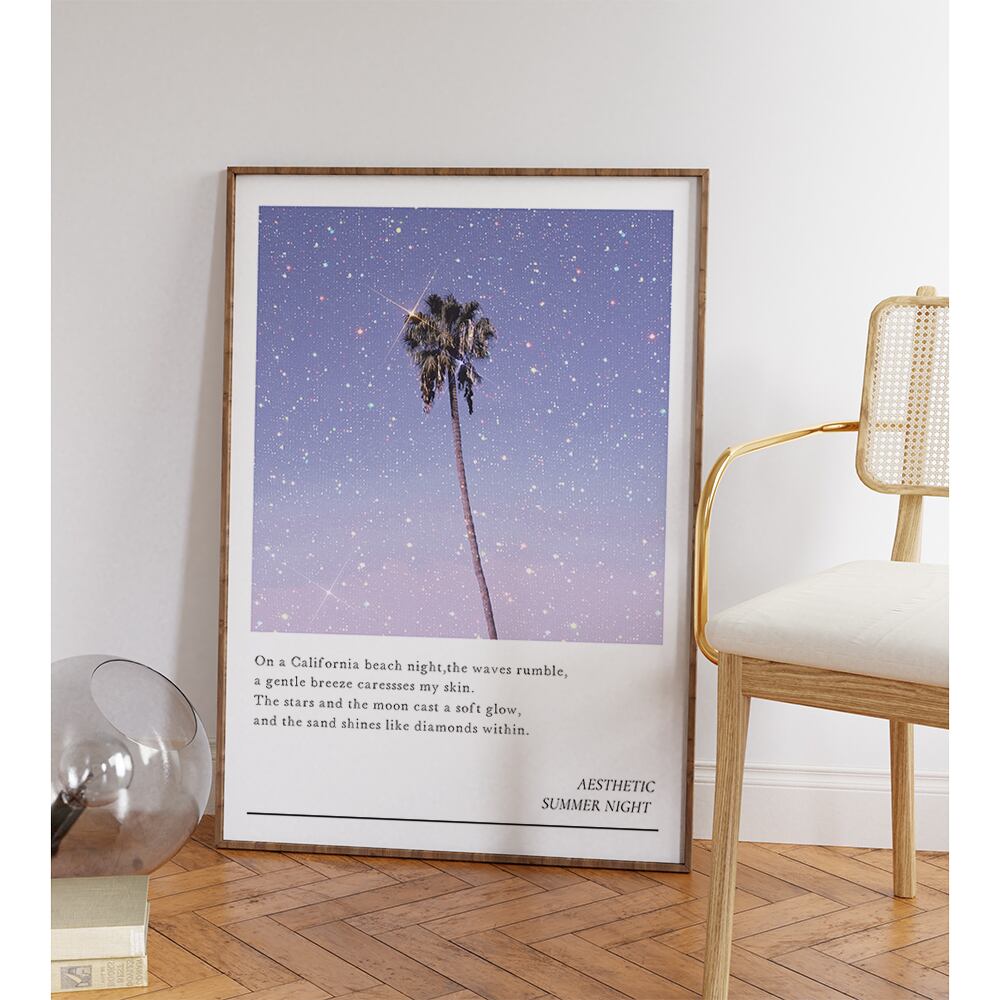夏の夜の風景を切り取った、ヤシの木のポスター。リゾート感溢れるデザインで、お部屋を華やかに演出します。ヤシの木が揺れる様子や、星がキラキラと輝く姿が、まるで夏の夜のように感じられます。絵画のように美しいポスターは、インテリアとしてだけでなく、感性も満たしてくれる一枚です。