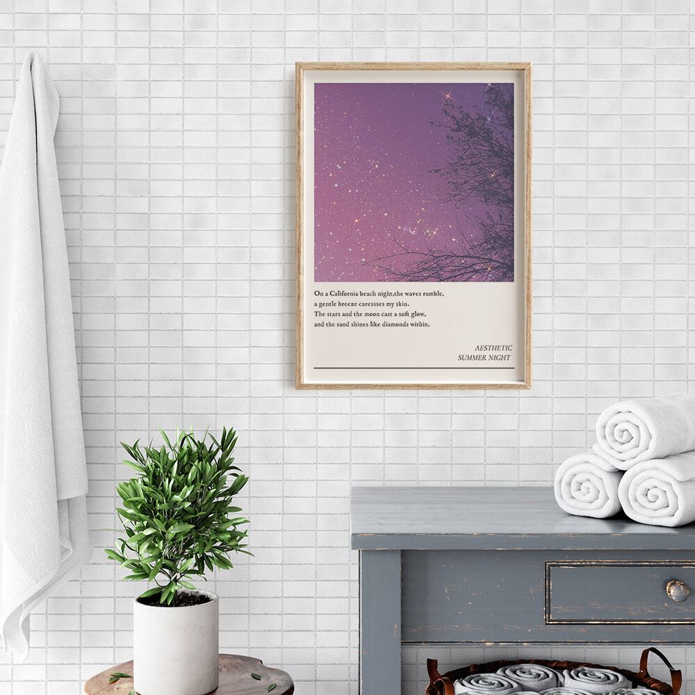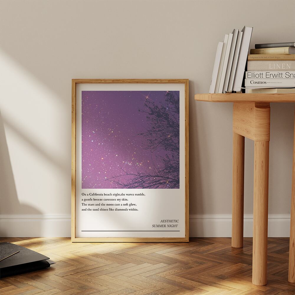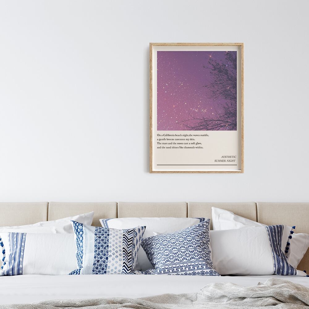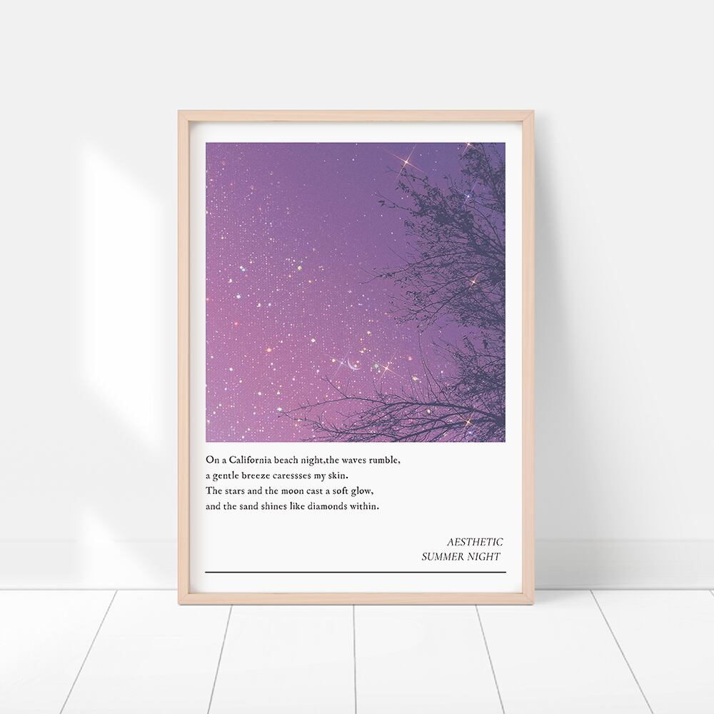 夏の夜の風景を切り取った、ヤシの木のポスター。リゾート感溢れるデザインで、お部屋を華やかに演出します。ヤシの木が揺れる様子や、星がキラキラと輝く姿が、まるで夏の夜のように感じられます。絵画のように美しいポスターは、インテリアとしてだけでなく、感性も満たしてくれる一枚です。