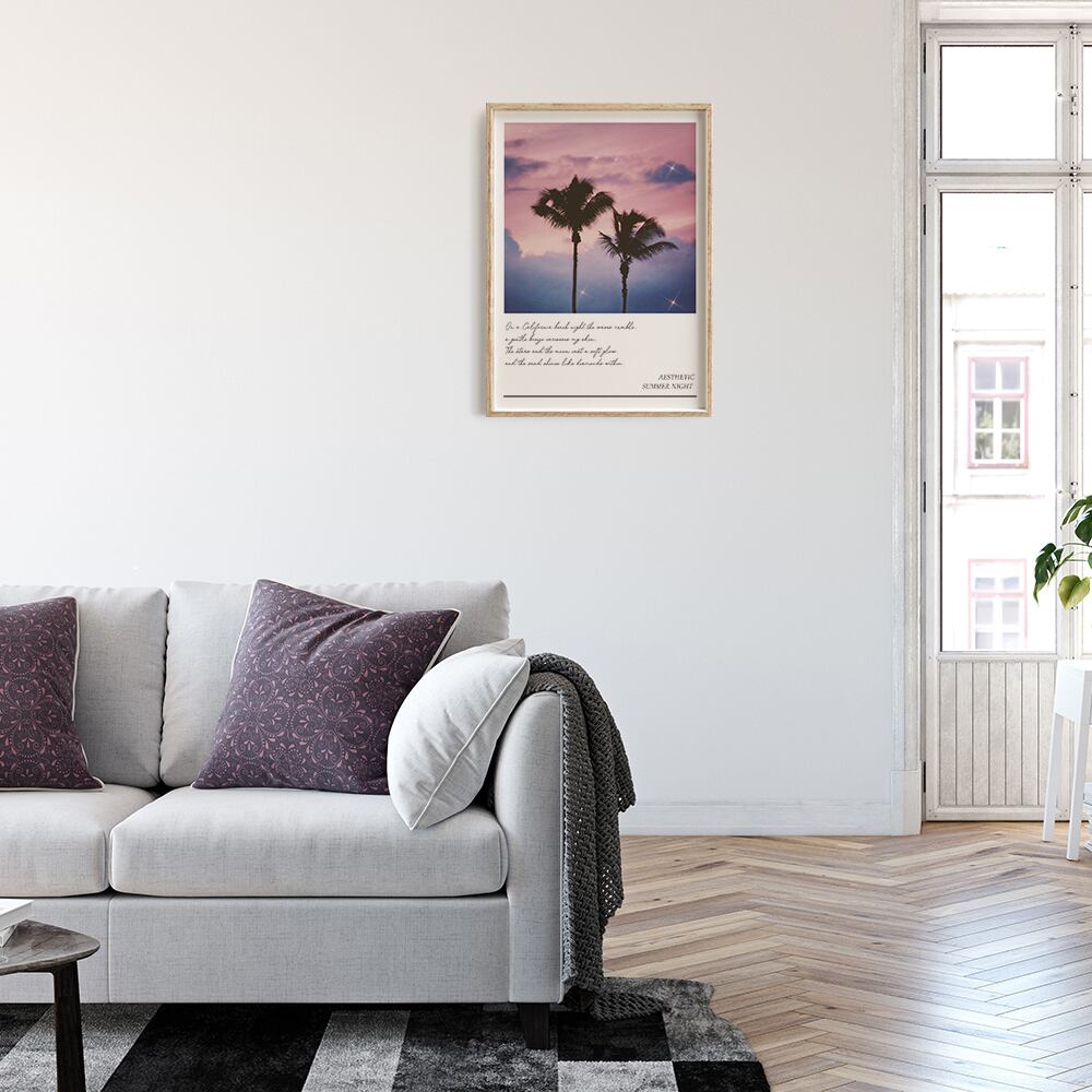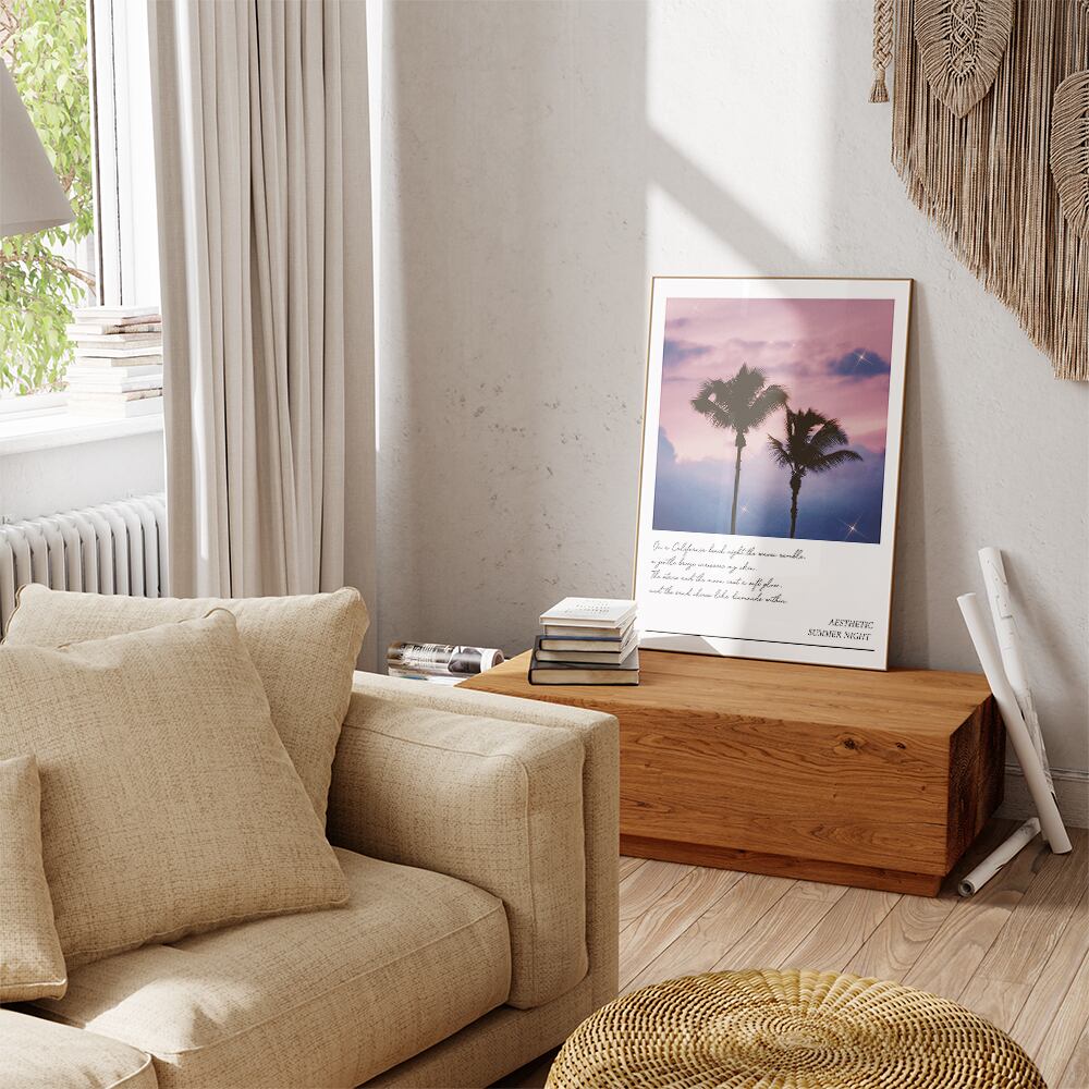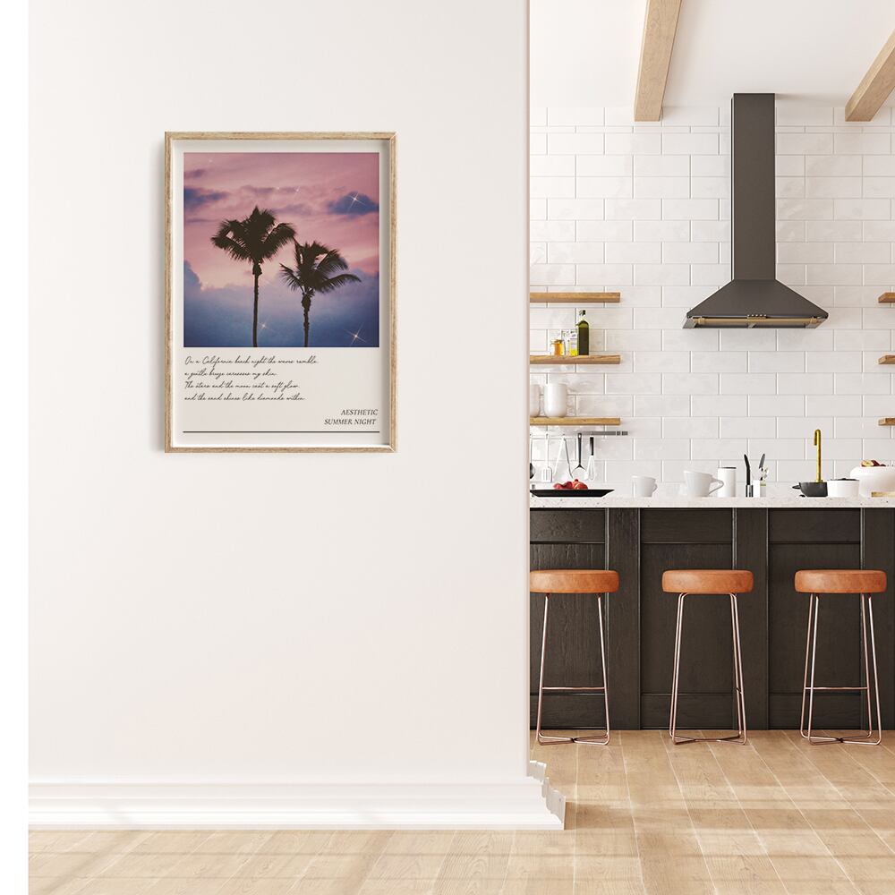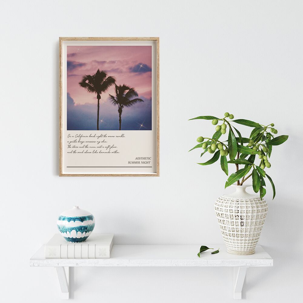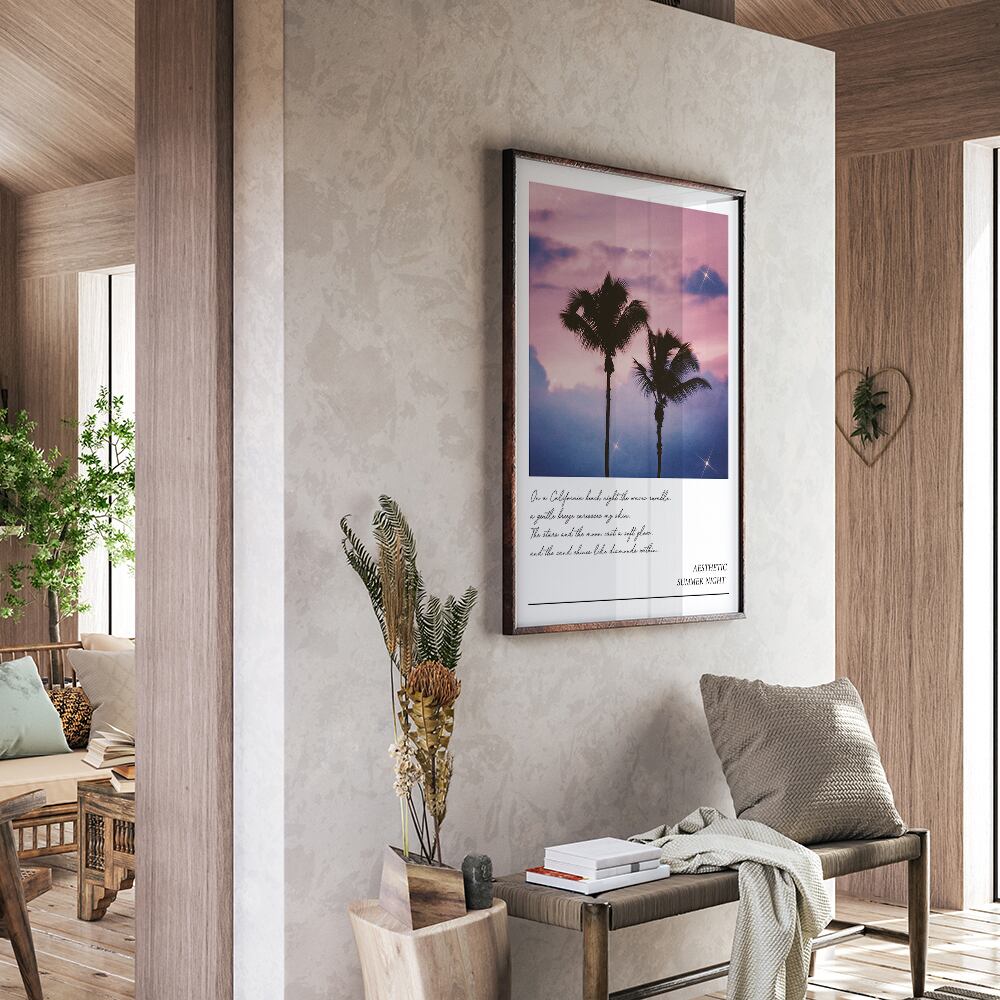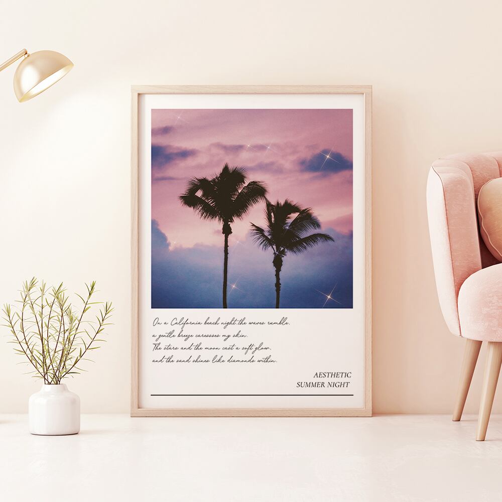 夏の夜の風景を切り取った、ヤシの木のポスター。リゾート感溢れるデザインで、お部屋を華やかに演出します。ヤシの木が揺れる様子や、星がキラキラと輝く姿が、まるで夏の夜のように感じられます。絵画のように美しいポスターは、インテリアとしてだけでなく、感性も満たしてくれる一枚です。