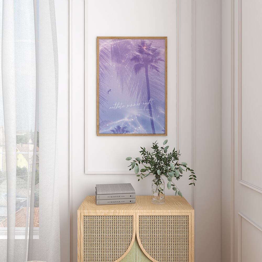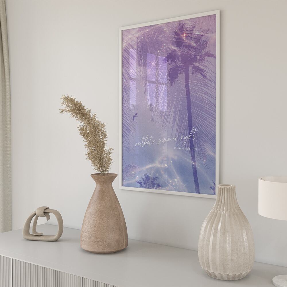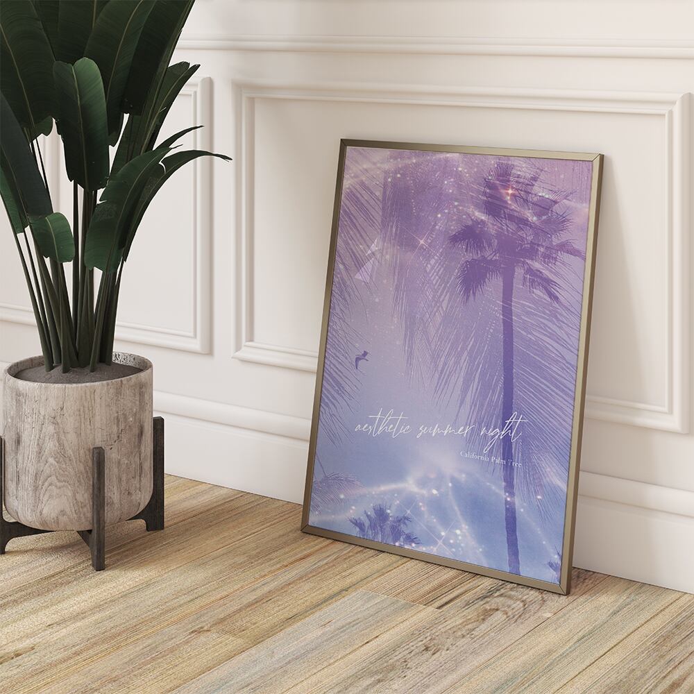 夏の夜空のポスターです。ヤシの木のビーチの風景を幻想的な青紫色の雰囲気に、キラキラした光が散りばめられています。控えめに英字をあしらっています。