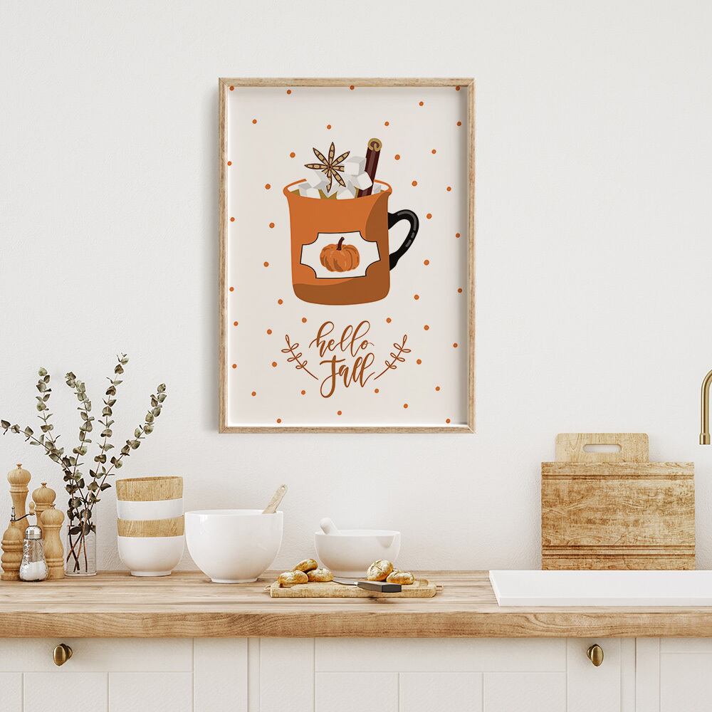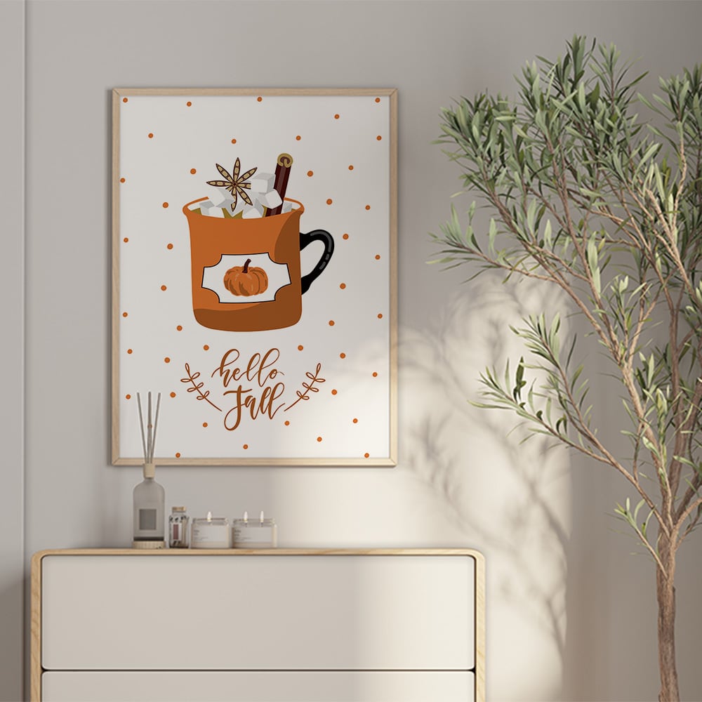 学校生活を楽しんでいる姿や、秋の風景が描かれたポスターです。かぼちゃや落ち葉、靴下など秋らしいアイテムも取り入れています。秋の雰囲気が感じられる色合いで、おしゃれなインテリアに仕上がります。