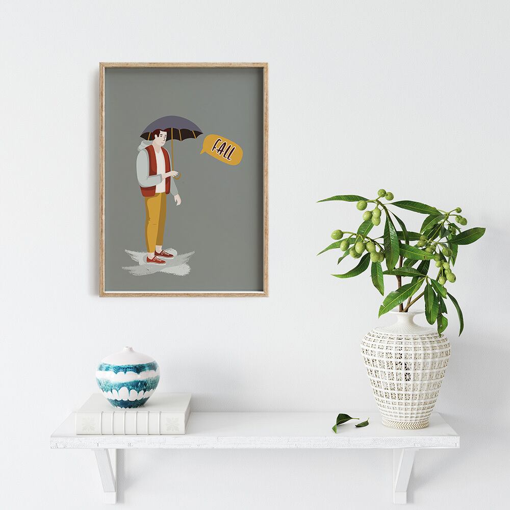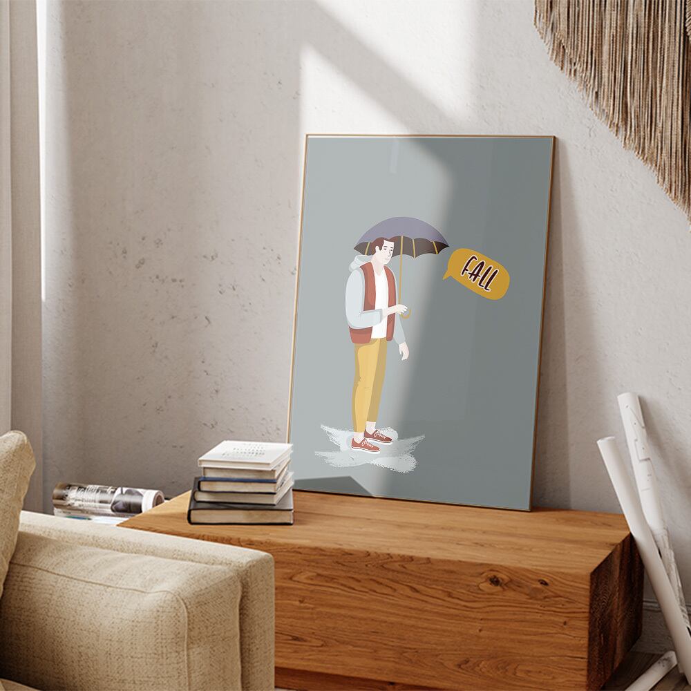 学校生活を楽しんでいる姿や、秋の風景が描かれたポスターです。かぼちゃや落ち葉、靴下など秋らしいアイテムも取り入れています。秋の雰囲気が感じられる色合いで、おしゃれなインテリアに仕上がります。