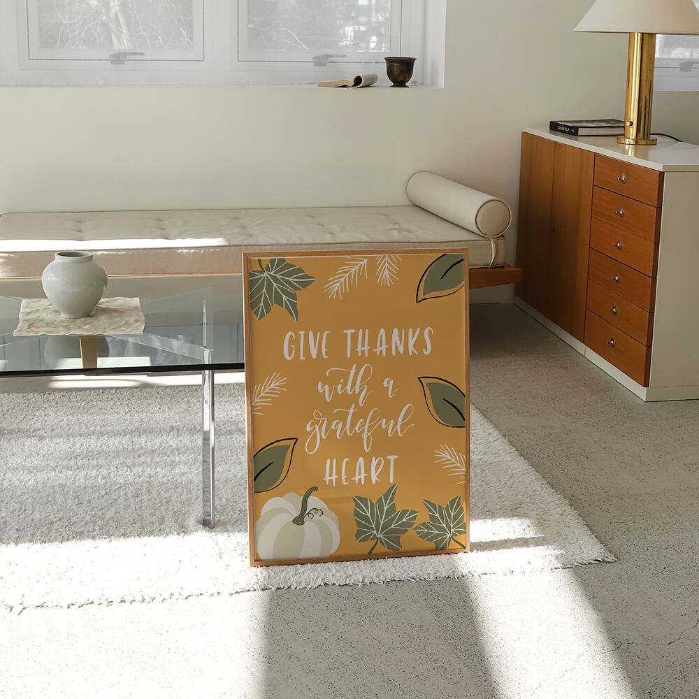 かぼちゃや秋の葉、英語の言葉などをデザインしたインテリアポスターです。秋の季節を表す名言と、その周囲をかぼちゃや葉っぱで装飾しています。英語の書体は丸みがあり、リラックスした雰囲気のものを使用しました。
