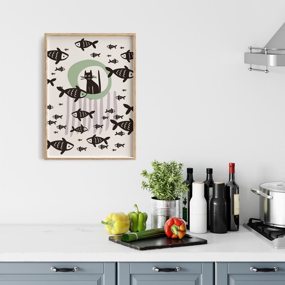 ハロウィンの黒猫のポスターです。近くにいる魚やねずみ、小鳥たちとの関係性も気になりますね!