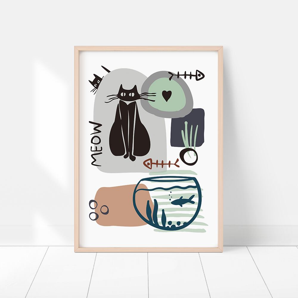 ハロウィンの黒猫のポスターです。近くにいる魚やねずみ、小鳥たちとの関係性も気になりますね!