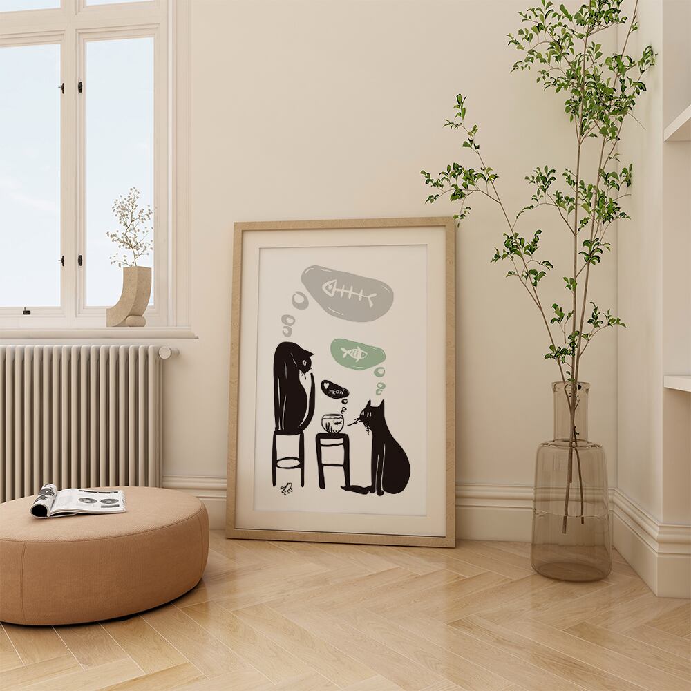 ハロウィンの黒猫のポスターです。近くにいる魚やねずみ、小鳥たちとの関係性も気になりますね!