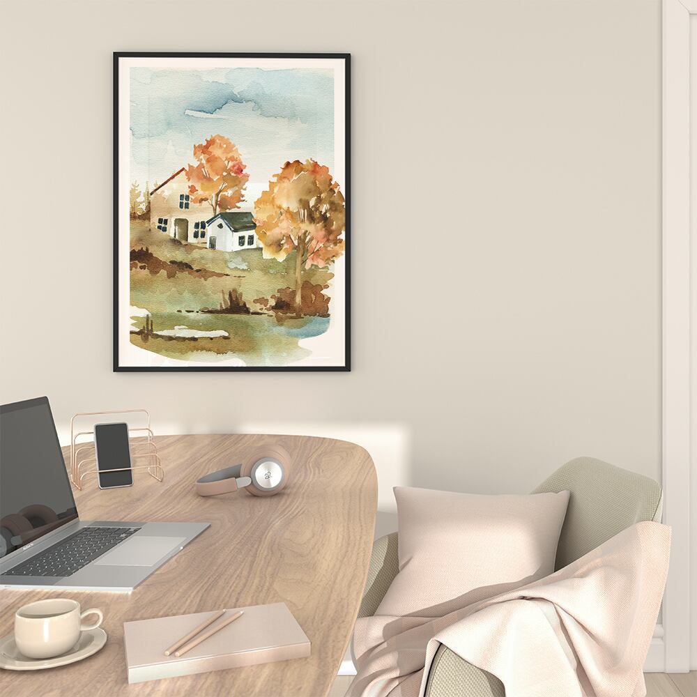 イチョウやもみじに彩られた、秋の風景です。優しいトーンの水彩画で、お部屋に安らぎを与えてくれます。ひと足早く、秋の空気を取り入れてみてはいかがでしょうか。