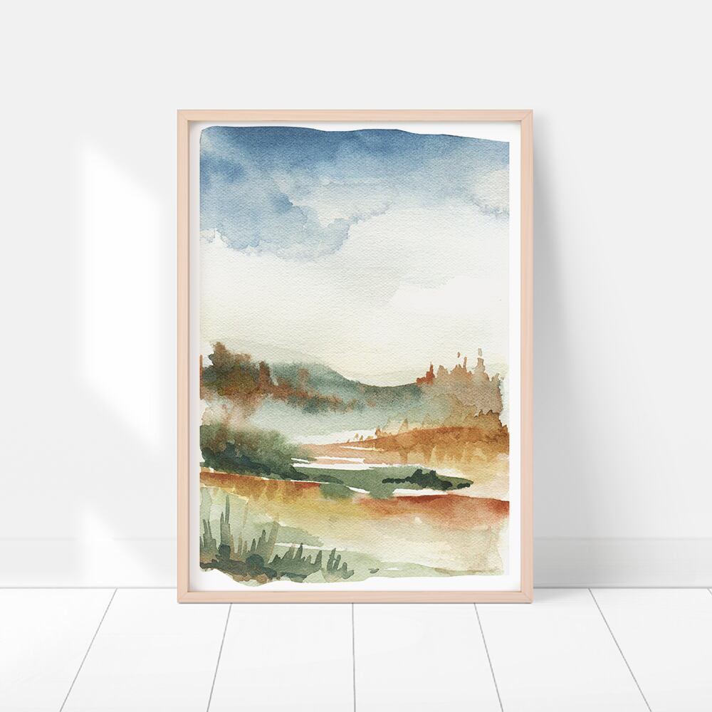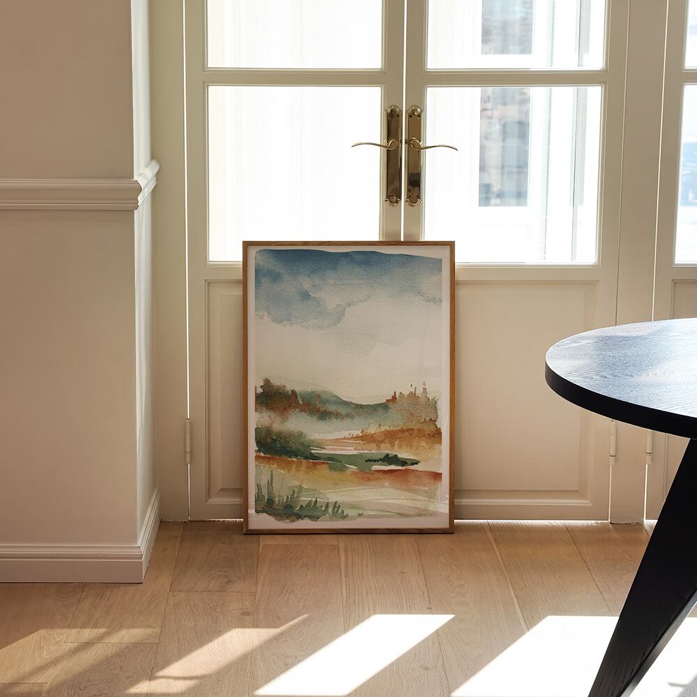 イチョウやもみじに彩られた、秋の風景です。優しいトーンの水彩画で、お部屋に安らぎを与えてくれます。ひと足早く、秋の空気を取り入れてみてはいかがでしょうか。