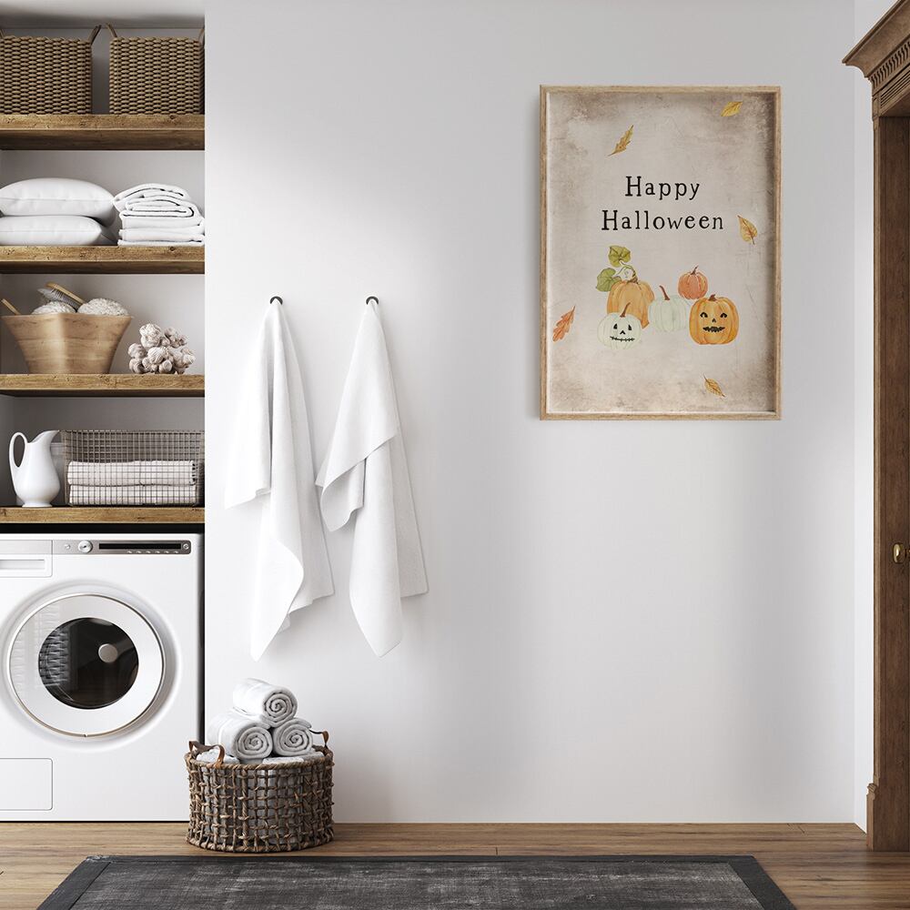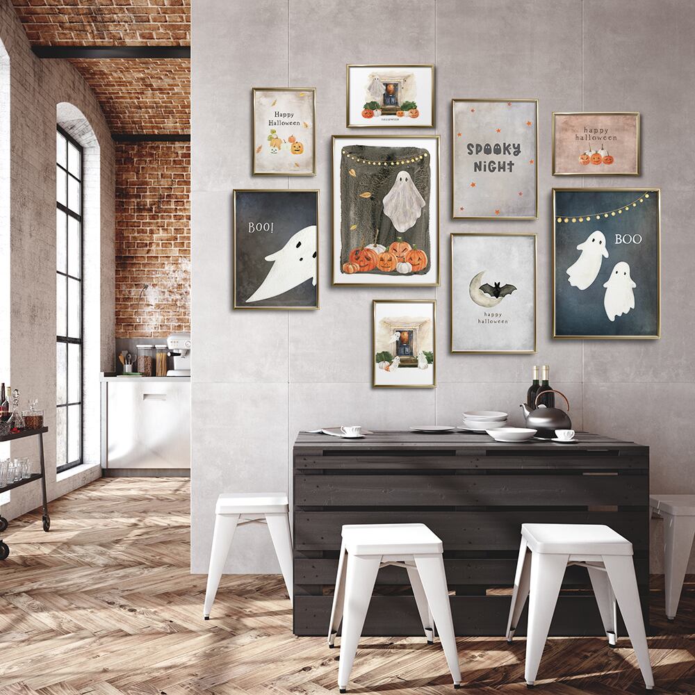 ハロウィンのおばけをテーマにしたポスターです。真夜中に通り過ぎるおばけや、パンプキンおばけやコウモリなどが描かれています。お部屋に飾ってハロウィンムードを演出したり、パーティーの装飾として使ったりするのにぴったりです。