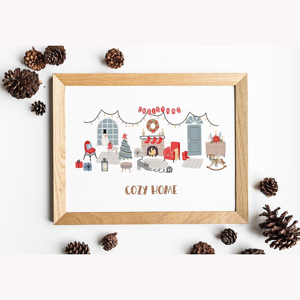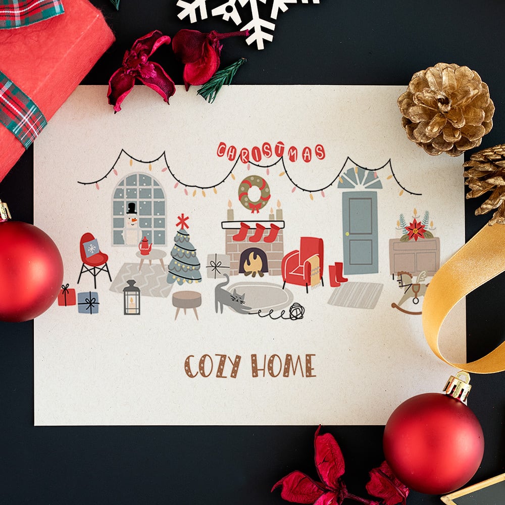 クリスマスのポスターです。スノードームや瓶に入った雪景色など、可愛くポップなイラストが特徴です。カラフルな色使いで明るい雰囲気のクリスマスを演出できます。