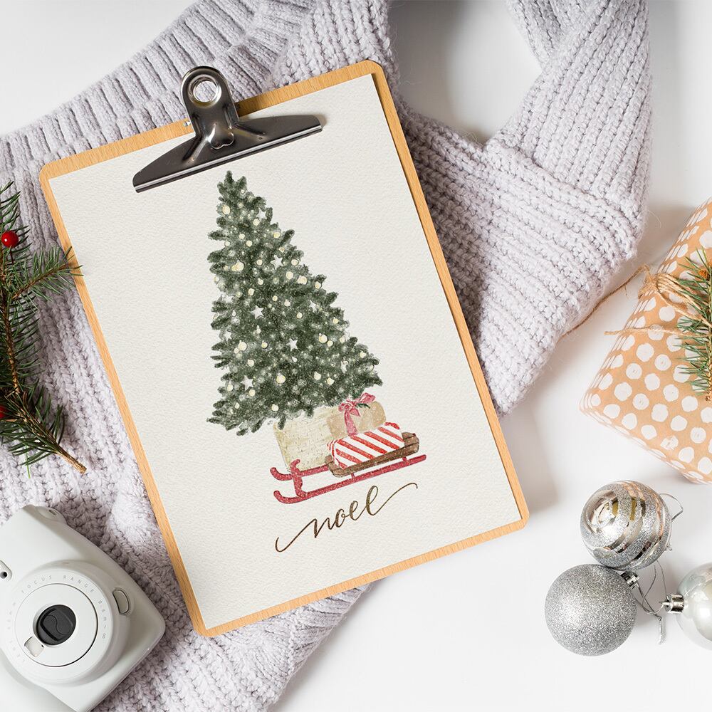 クリスマスのポスターです。プレゼントが入ったくつ下や、クリスマスツリー。赤い実がついた葉のリースやガーランド、クッキーや飲み物、スケート靴など、いろいろなモチーフを使用しています。優しい水彩タッチで、シンプルながらも品のあるポスターに仕上がっています。