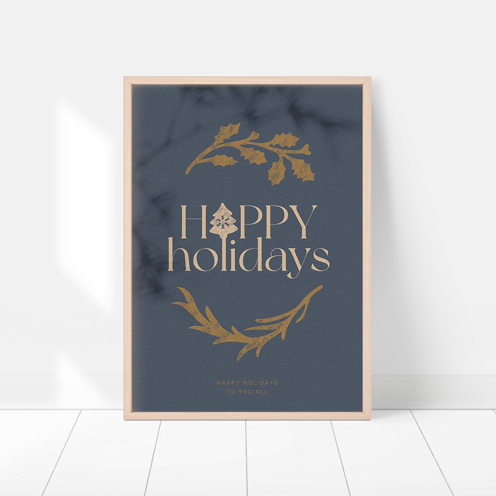 大人っぽいシックな色合いのクリスマスポスターです。紺色、ワインレッド、マスタード、くすみピンクなどを背景にして英字を配置し、クリスマスツリーやトナカイ、雪の結晶やオーナメントなどで飾りました。