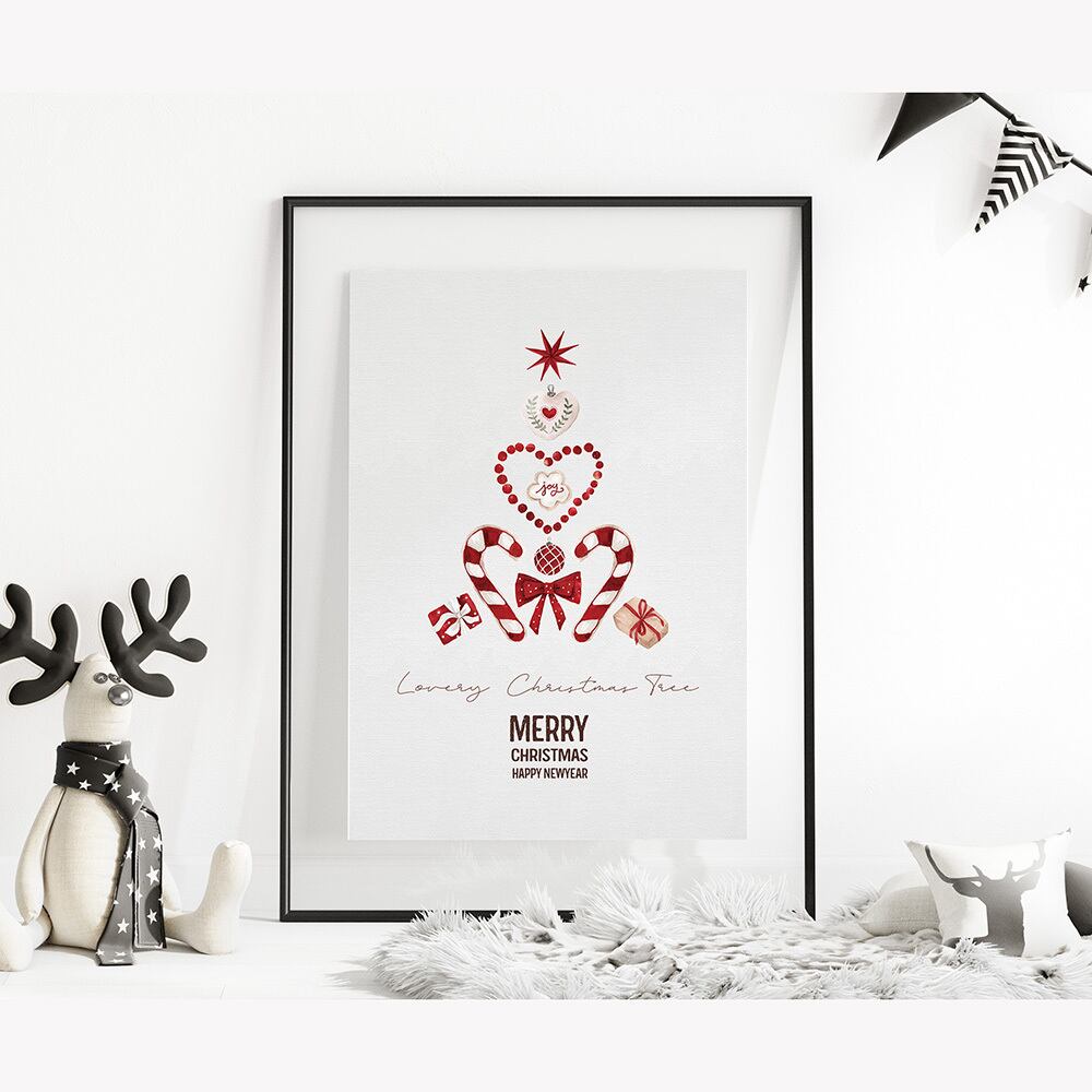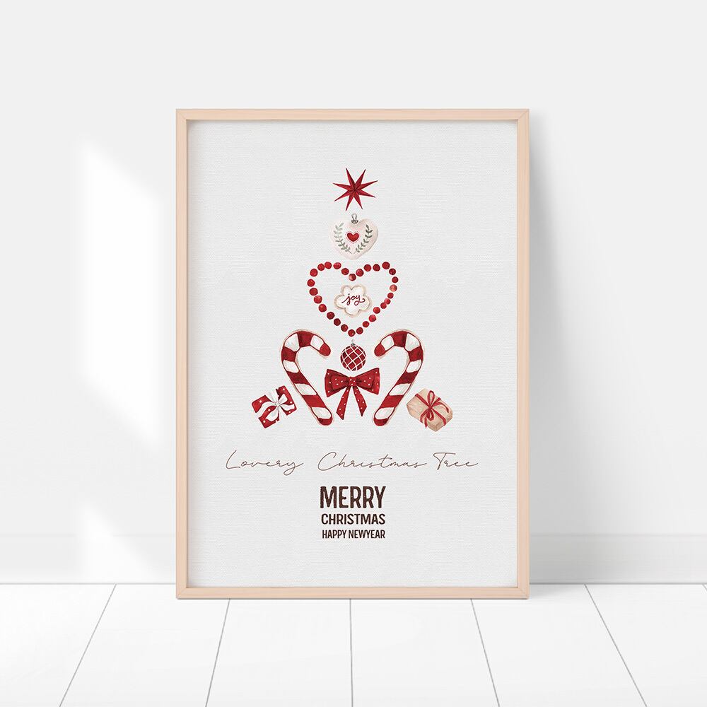 にぎやかなクリスマスシーズンを演出する、クリスマスツリーのポスターです。クリスマスツリーの他にクリスマスらしいヒイラギなどの植物、靴下やオーナメント、星の飾りなどの小物を加えて、よりクリスマスらしく仕上げました。ランダムに数枚選んで飾るのもおすすめです。