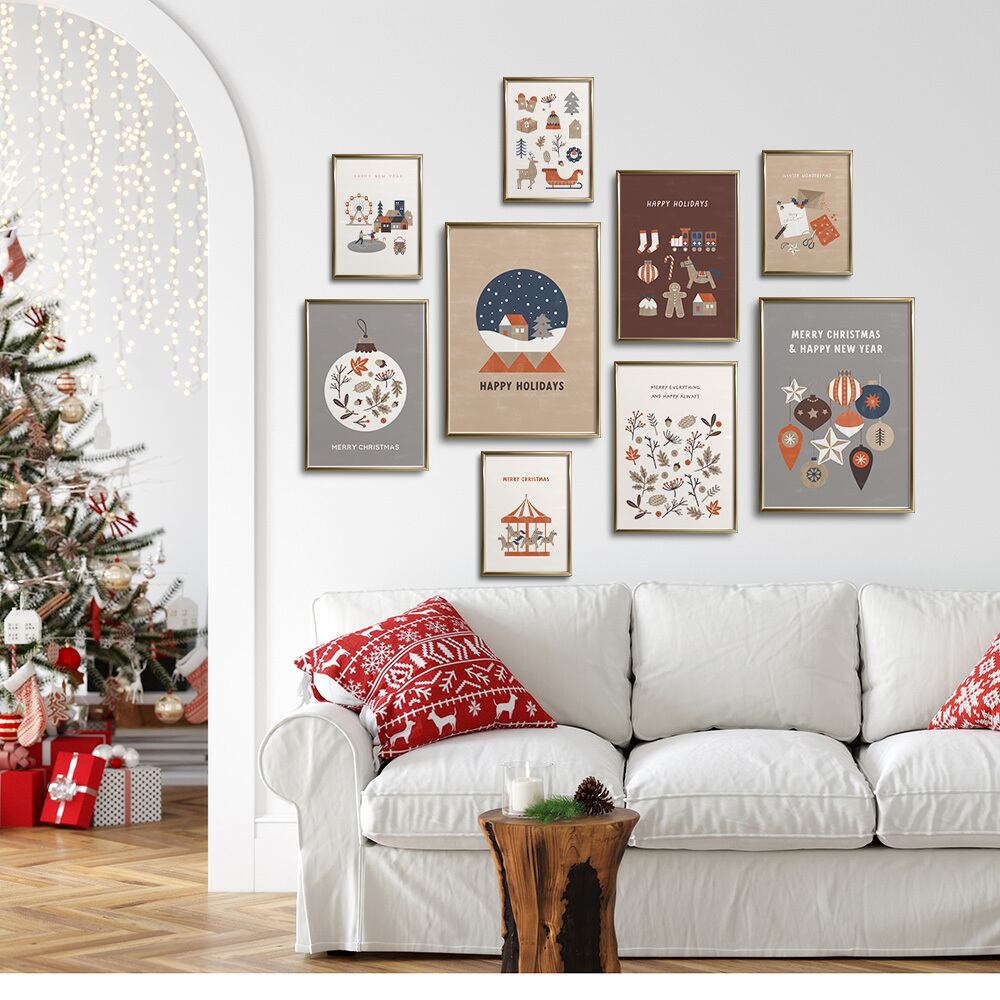 北欧のクリスマスポスターです。サンタクロースやトナカイ、うさぎ、ユニコーン、靴下やプレゼントなどのクリスマスアイテムをモチーフにしています。色味はくすんだブルーやピンク、グレーやエンジなどの、落ち着いた色を使用しています。