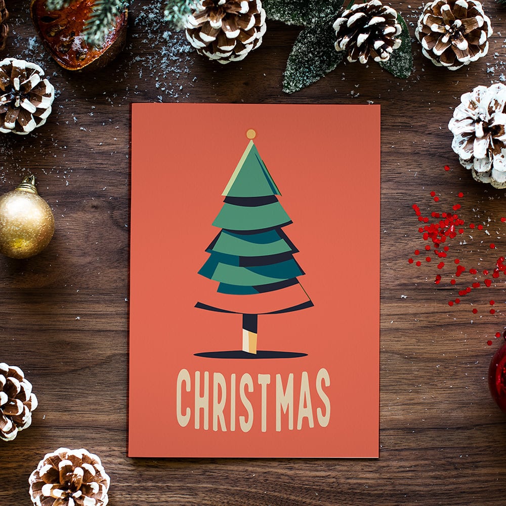 冬の街のポスターです。赤い車と街並みや、雪だるま、クリスマスツリー、オーナメント、ジンジャークッキーなどをモチーフにしています。オレンジがかった赤い家と、くすんだ水色や緑色など、レトロな雰囲気が感じられます。