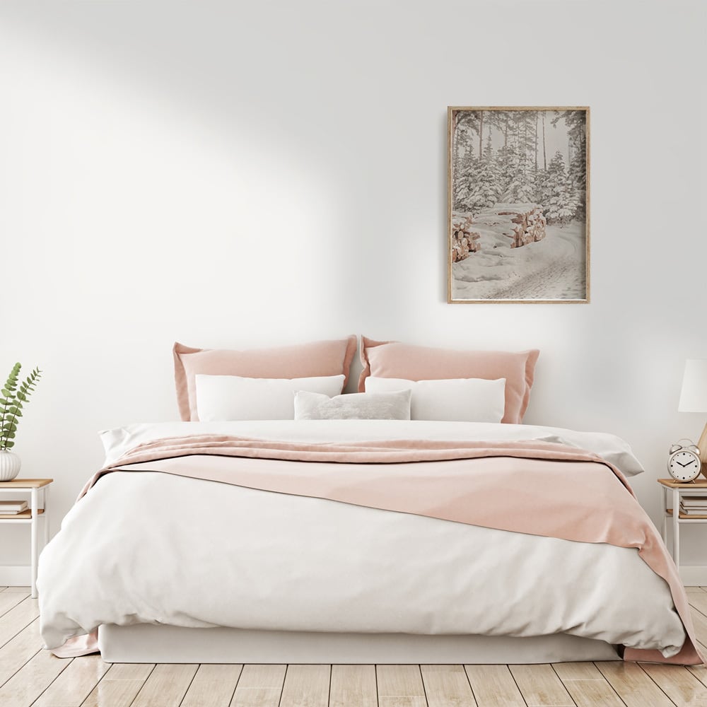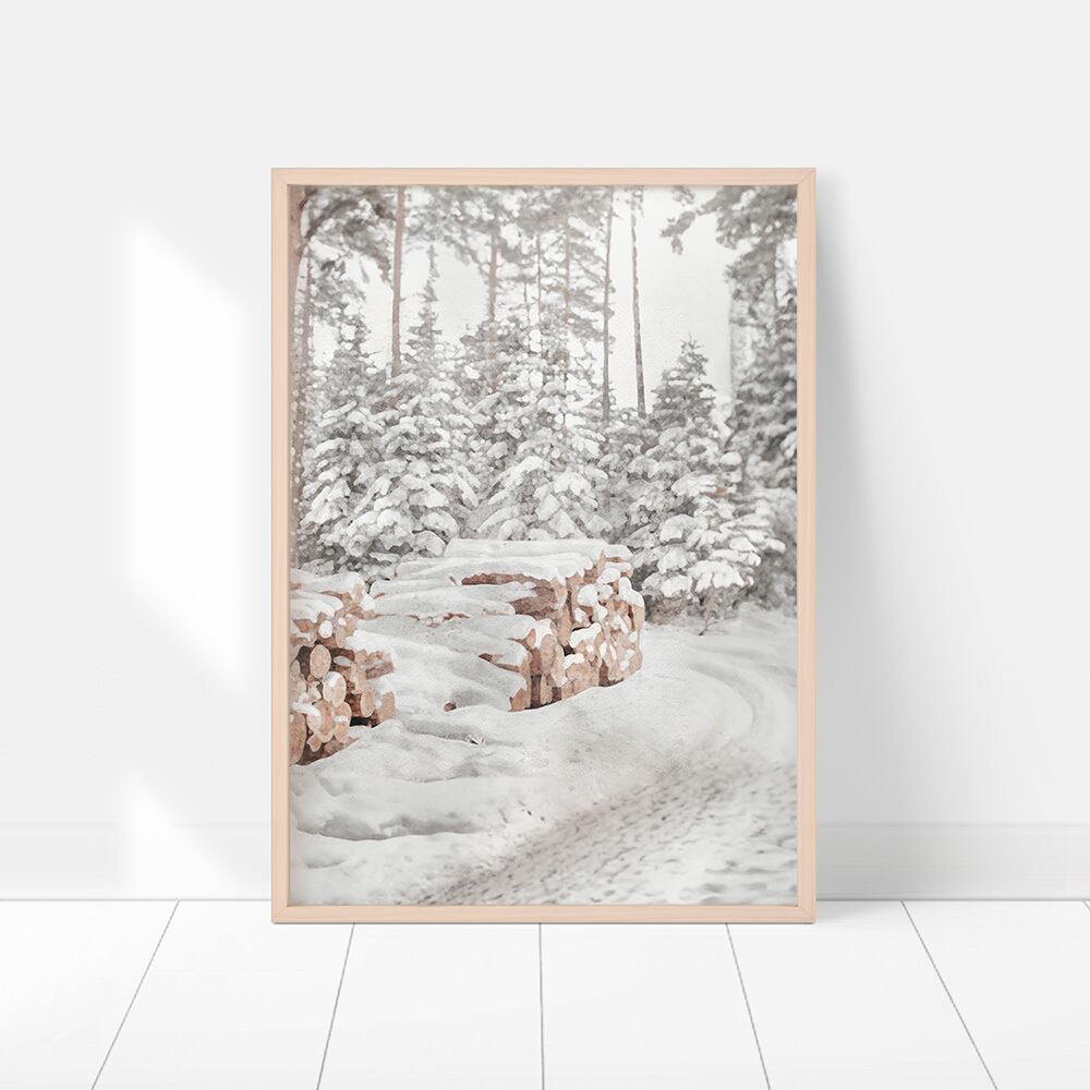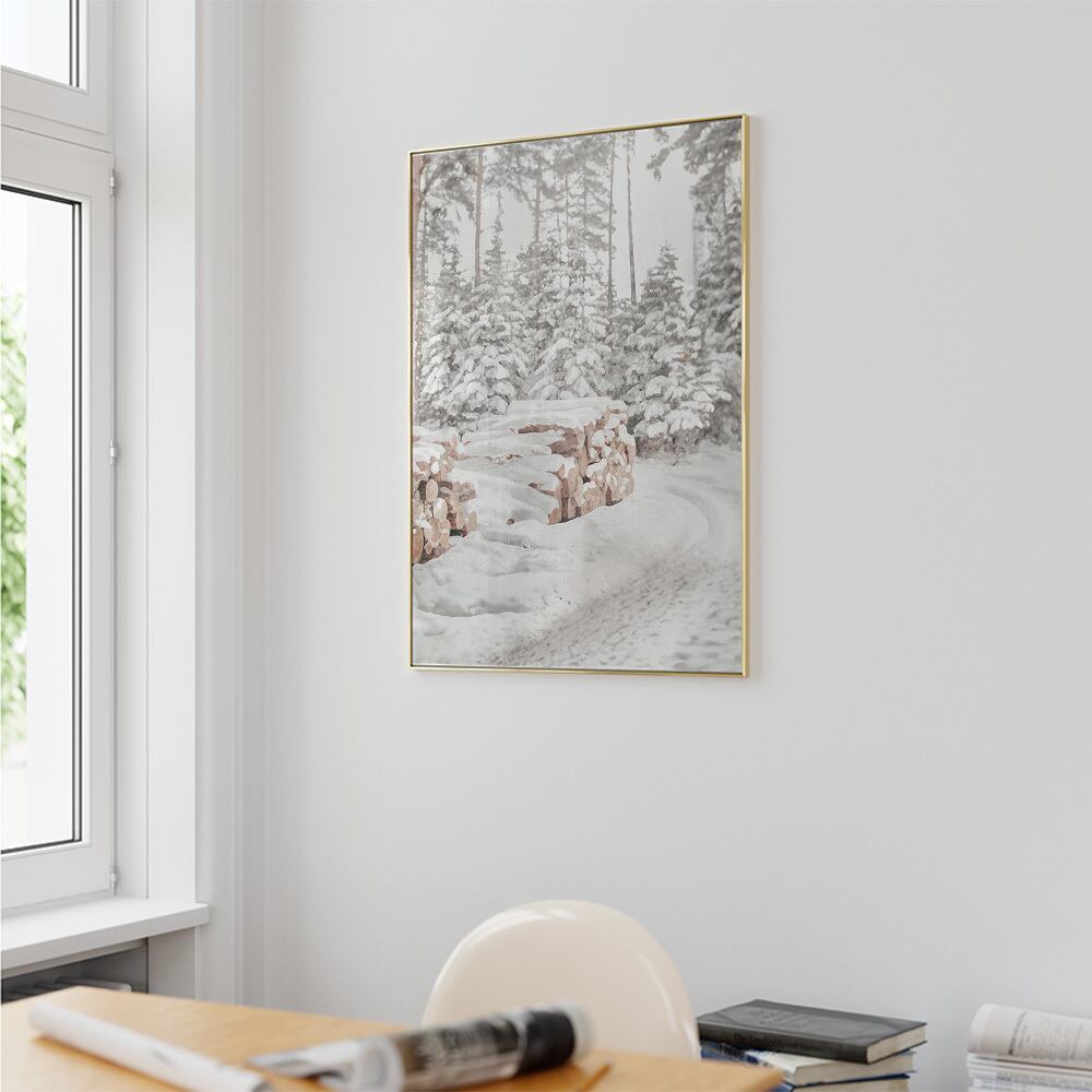 雪に覆われた美しい風景のポスターです。写真をモチーフに、少々水彩画風の加工が施されています。