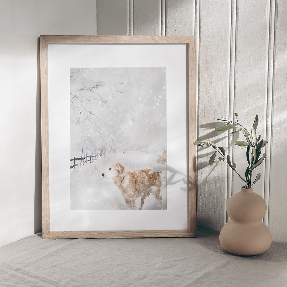 雪の中で遊ぶ犬のポスター / i1657 / 雪が降り積もった冬の森 動物たち インテリアポスター