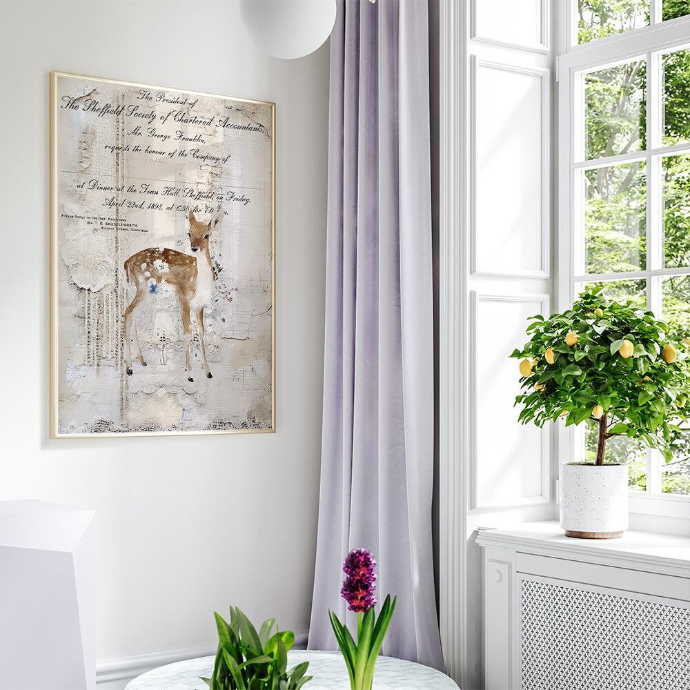 鹿、きつね、うさぎ、小鳥といった可愛らしい動物のモチーフが描かれたポスターです。白や青の冬の花で華やかに彩られ、背景にはアンティーク調の風合いやニットの模様を使用しています。部屋を華やかに彩り、温かい雰囲気を演出してくれます。