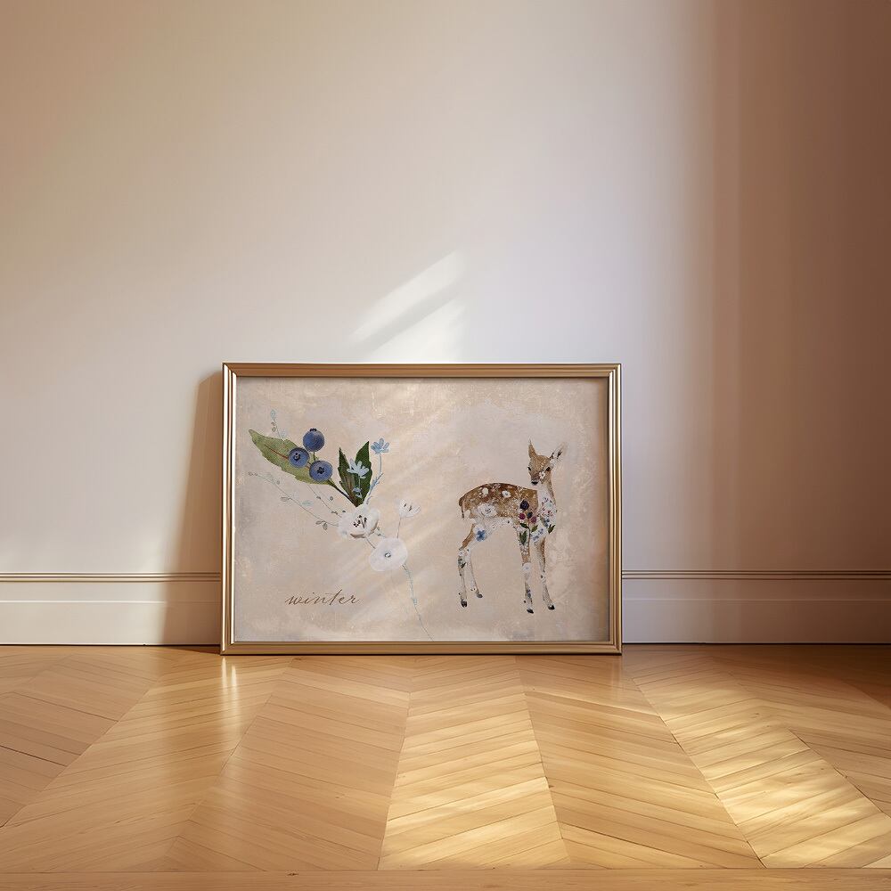 鹿、きつね、うさぎ、小鳥といった可愛らしい動物のモチーフが描かれたポスターです。白や青の冬の花で華やかに彩られ、背景にはアンティーク調の風合いやニットの模様を使用しています。部屋を華やかに彩り、温かい雰囲気を演出してくれます。