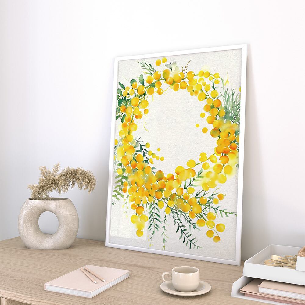 水彩タッチのミモザのポスターです。丸いリースやハート型のリース、花束など色々なタイプをご用意しました。鮮やかな黄色が、お部屋に明るく爽やかな雰囲気を演出してくれます。