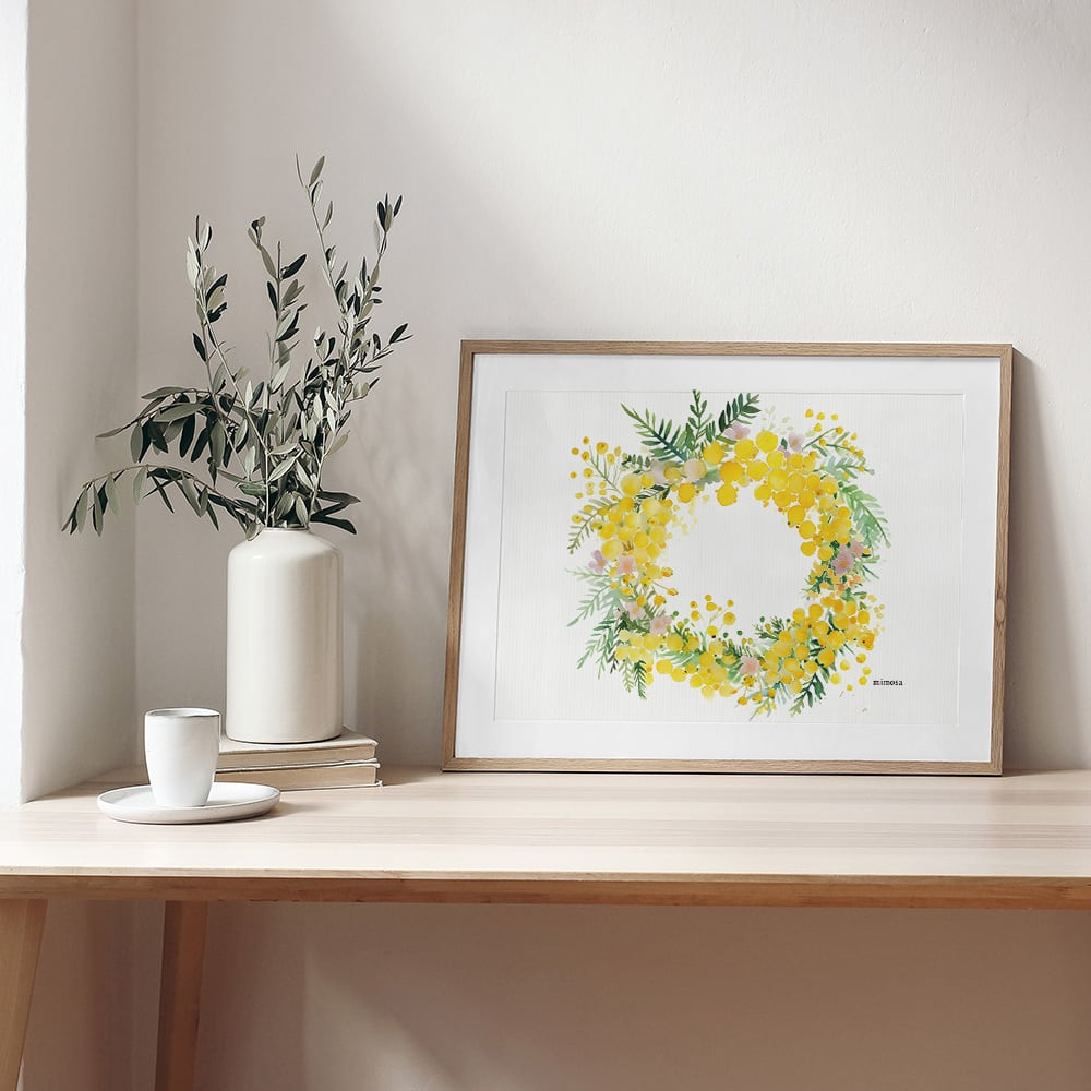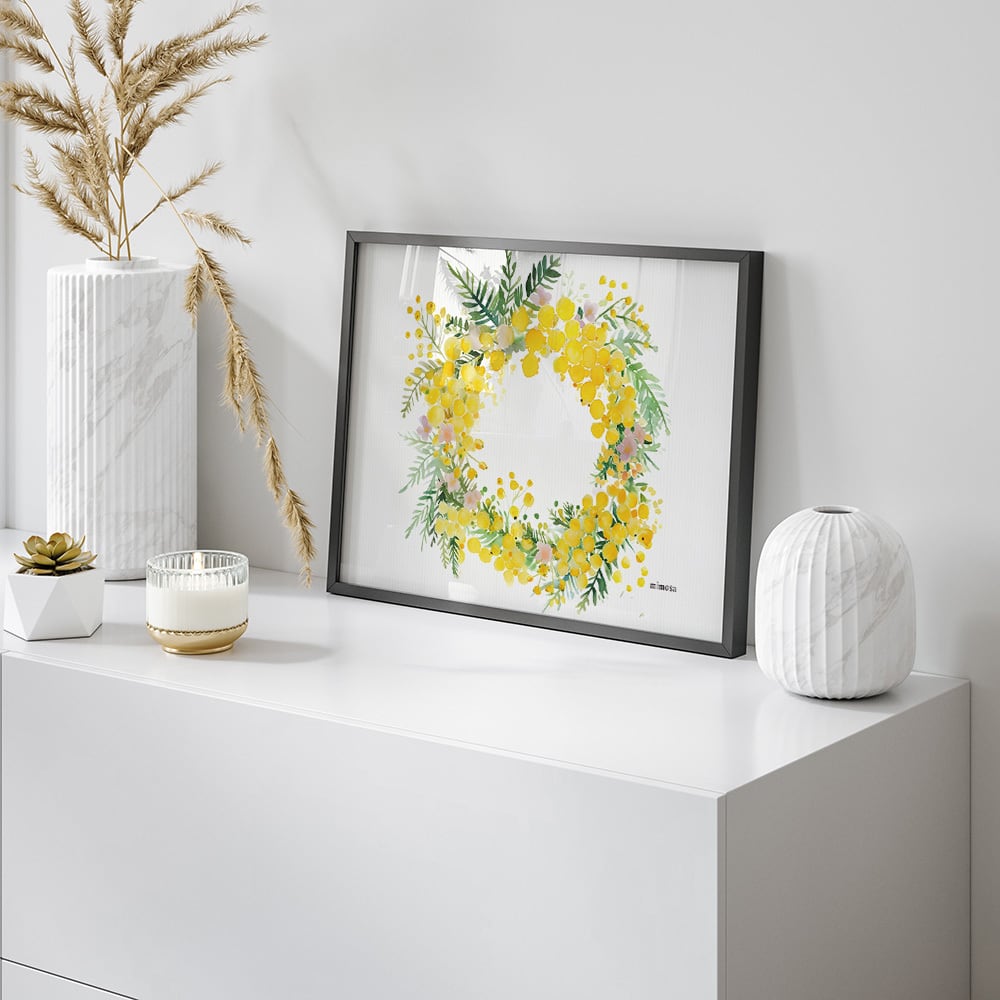 水彩タッチのミモザのポスターです。丸いリースやハート型のリース、花束など色々なタイプをご用意しました。鮮やかな黄色が、お部屋に明るく爽やかな雰囲気を演出してくれます。