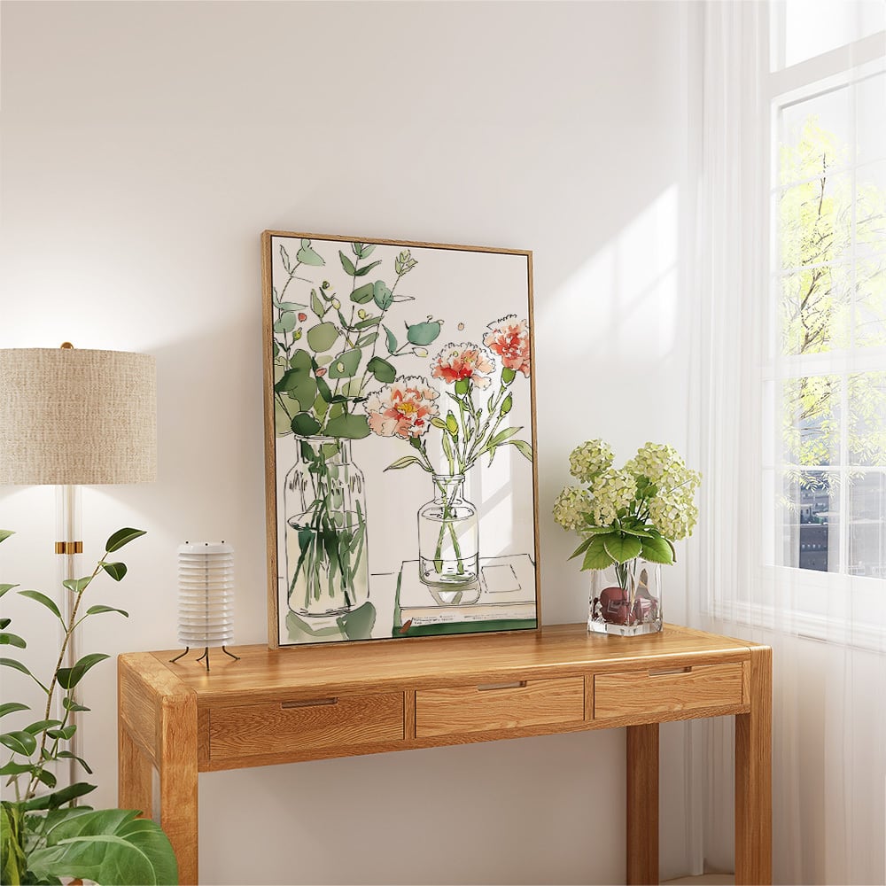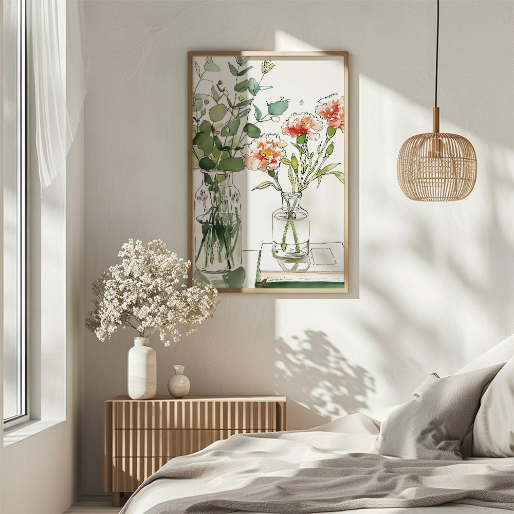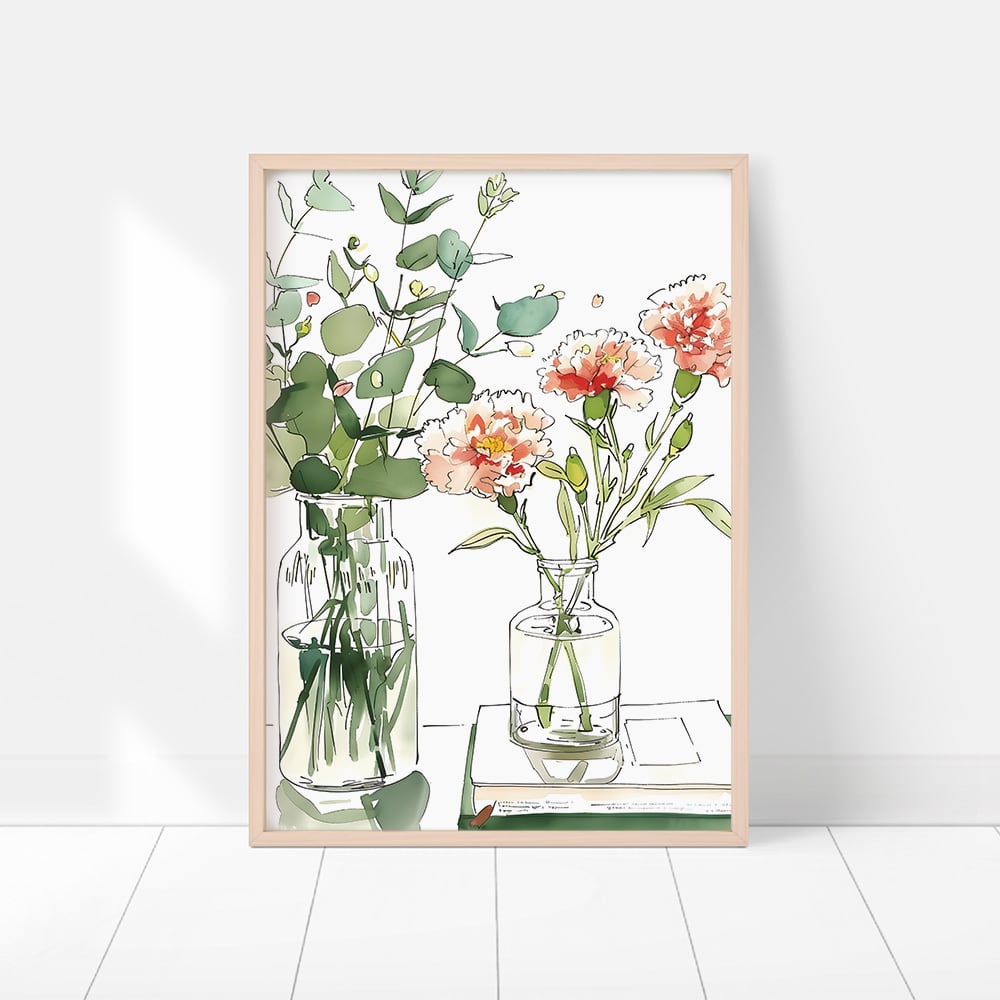 カーネーションのある風景のポスターです。赤とベージュの落ち着いた色合いのカーネーションが、いくつかのガラスの花瓶に活けられています。ナチュラルな雰囲気のお部屋になります。