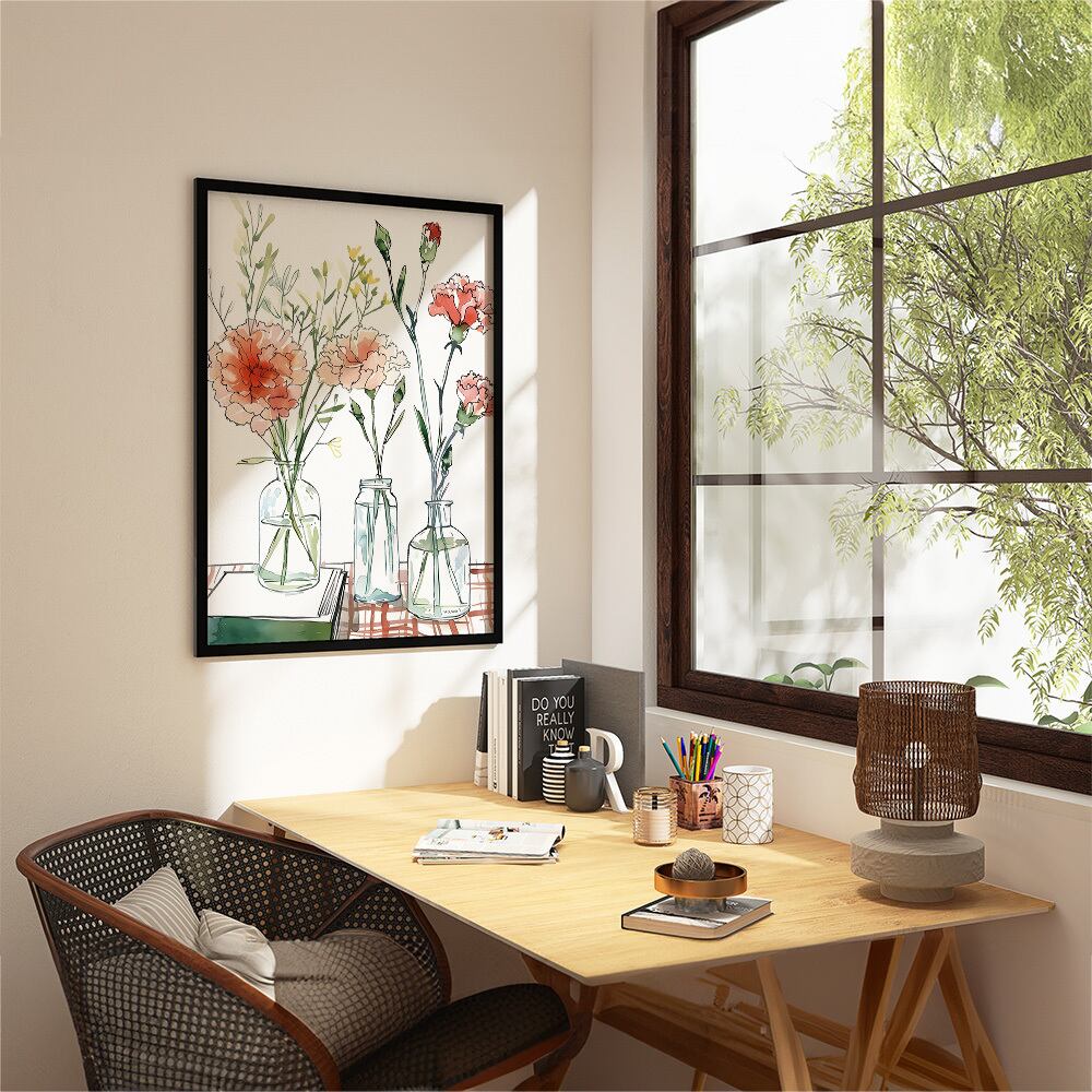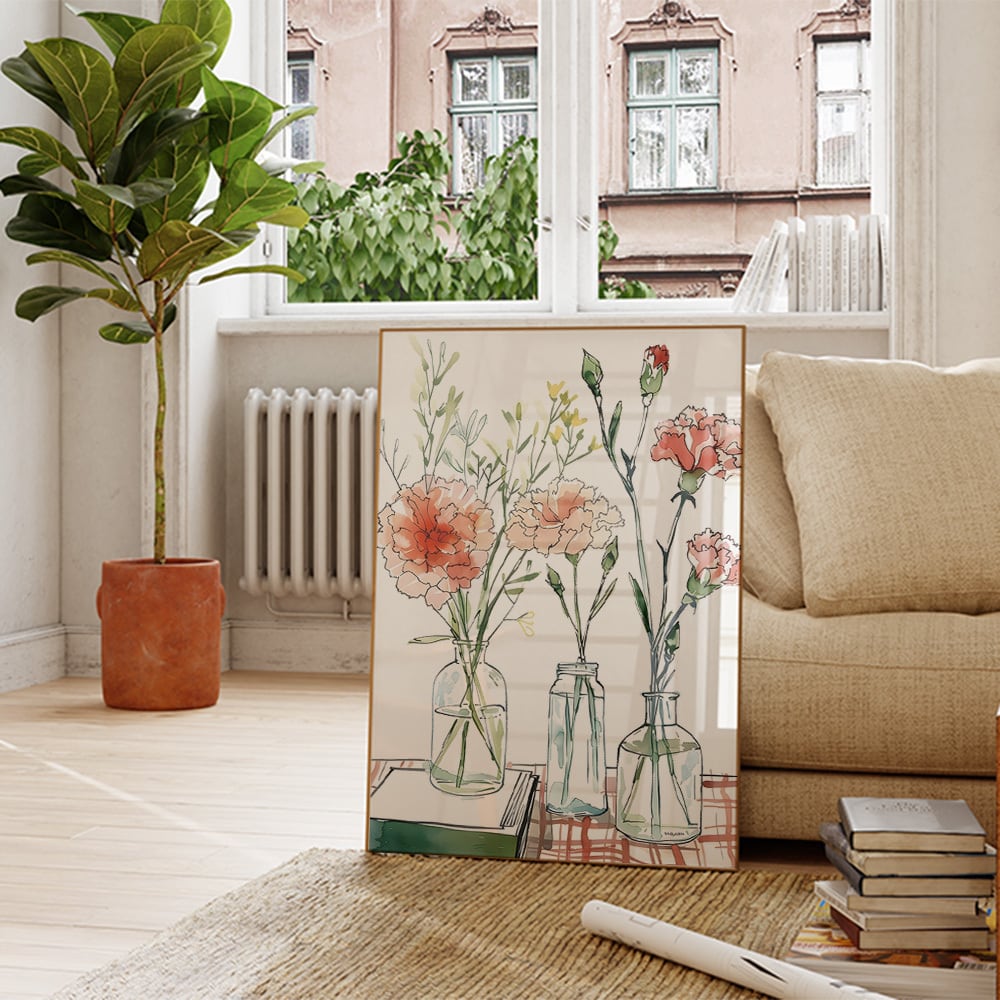 カーネーションのある風景のポスターです。赤とベージュの落ち着いた色合いのカーネーションが、いくつかのガラスの花瓶に活けられています。ナチュラルな雰囲気のお部屋になります。