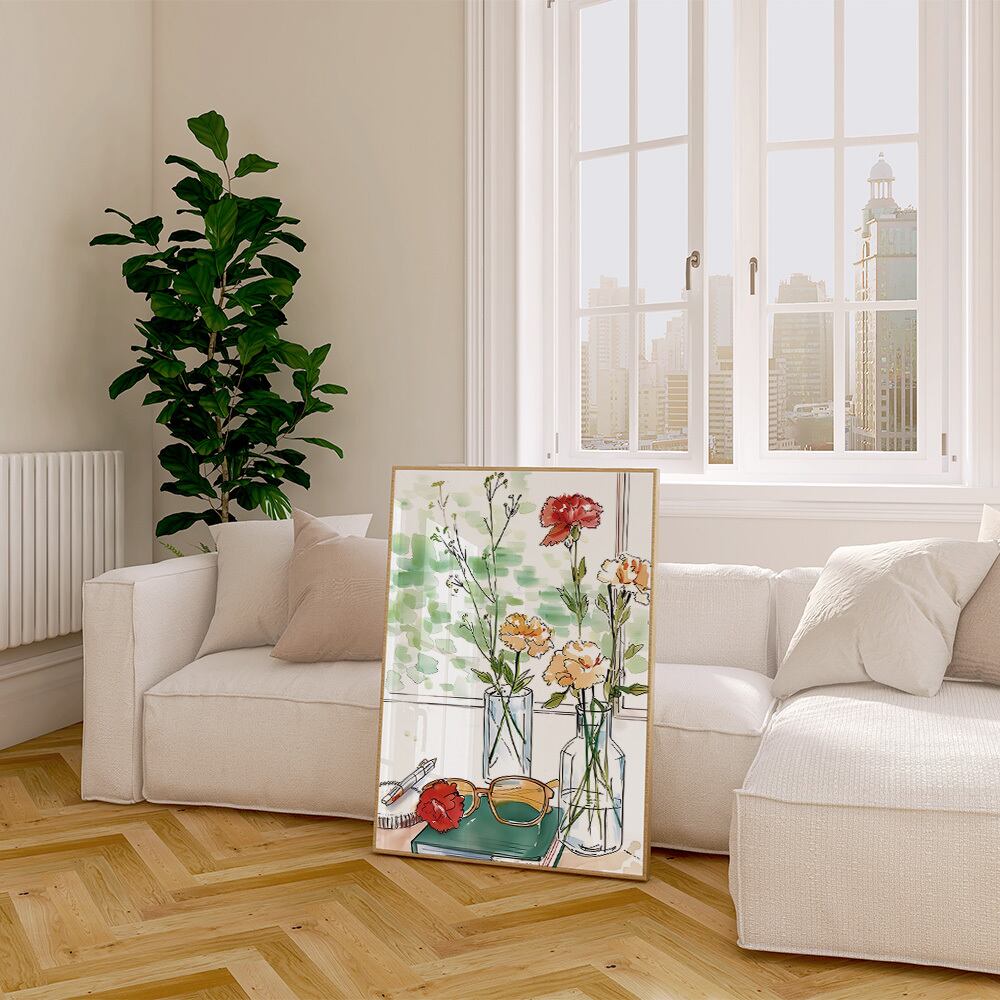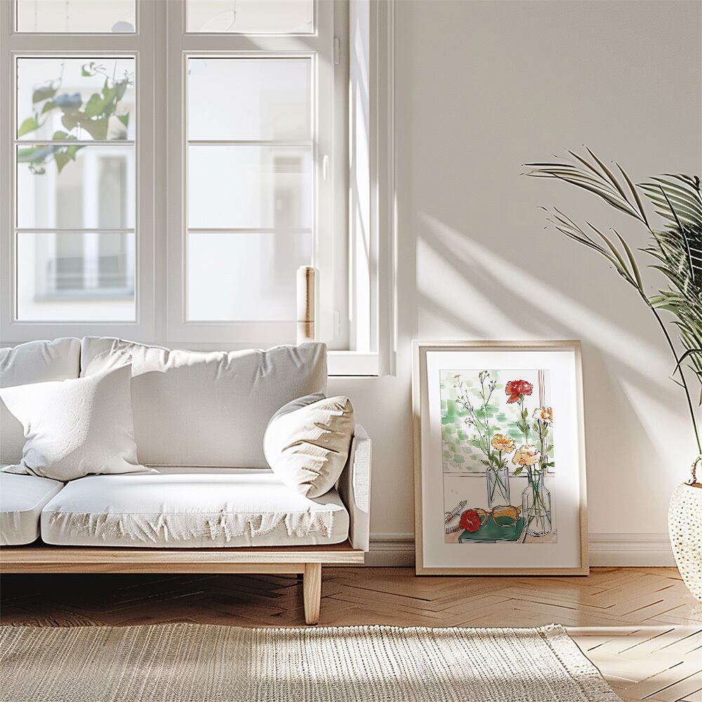 カーネーションのある風景のポスターです。赤とベージュの落ち着いた色合いのカーネーションが、いくつかのガラスの花瓶に活けられています。ナチュラルな雰囲気のお部屋になります。