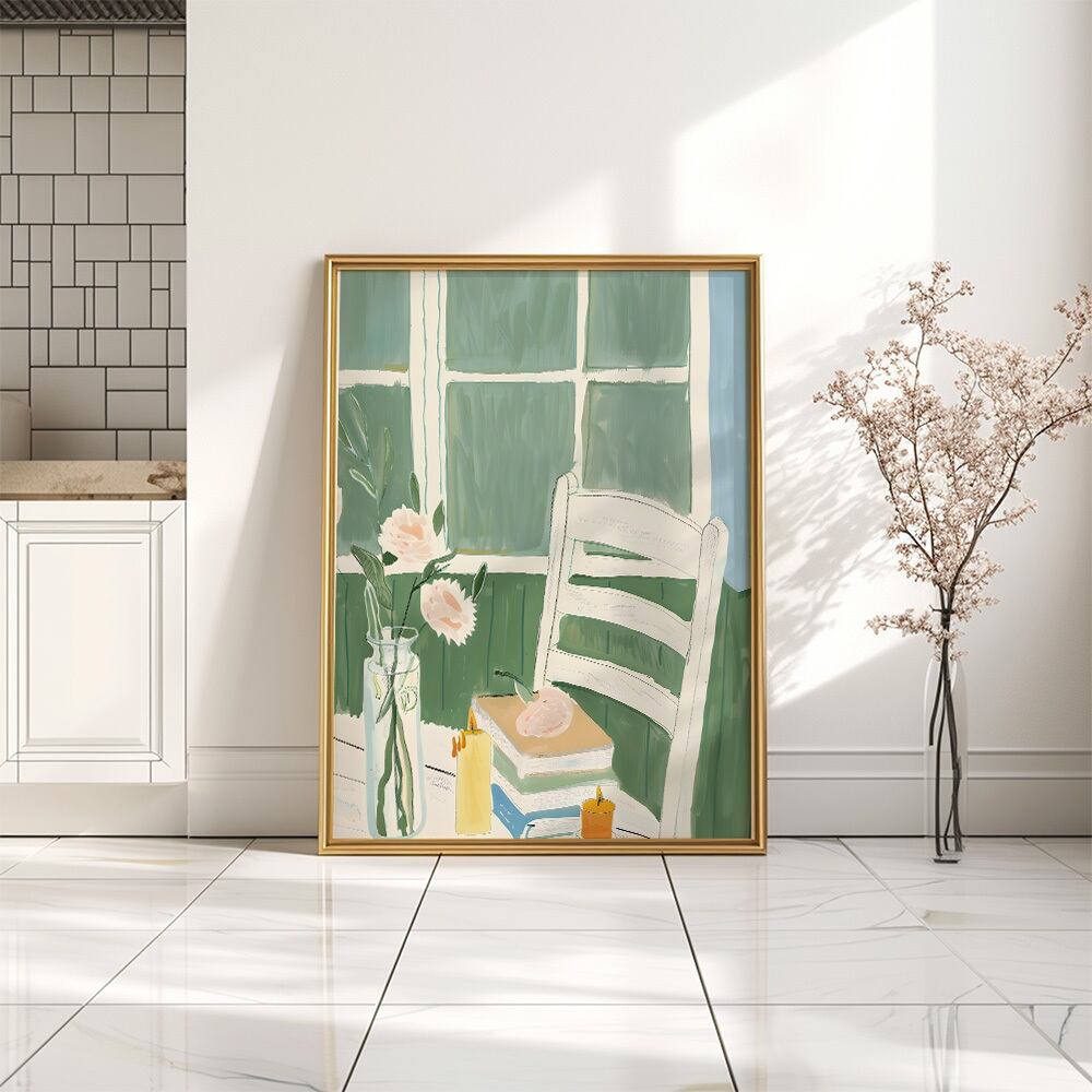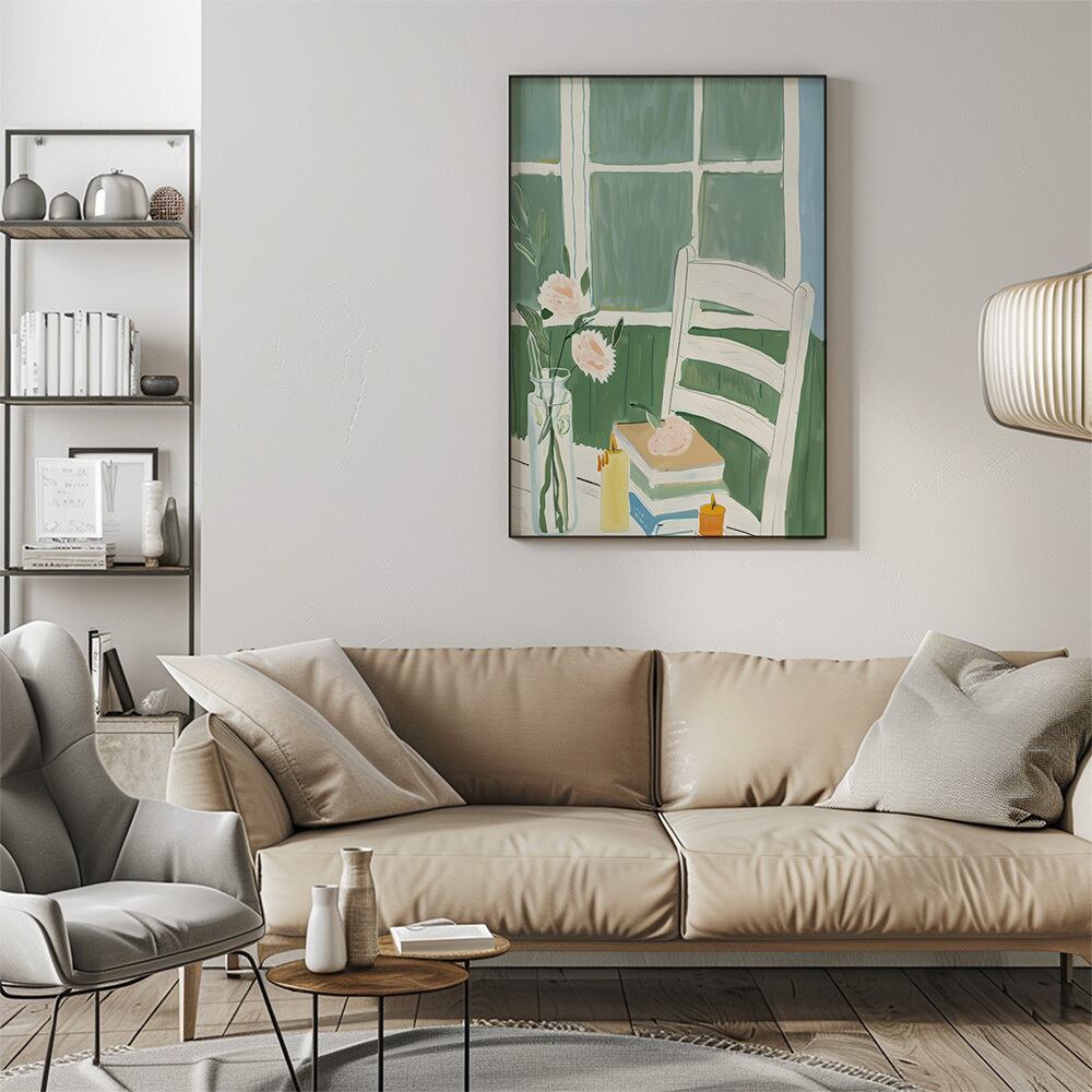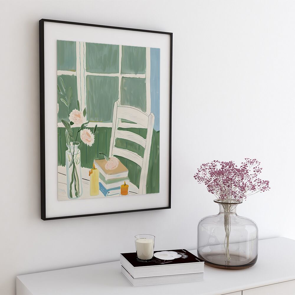 カーネーションのある風景のポスターです。赤とベージュの落ち着いた色合いのカーネーションが、いくつかのガラスの花瓶に活けられています。ナチュラルな雰囲気のお部屋になります。